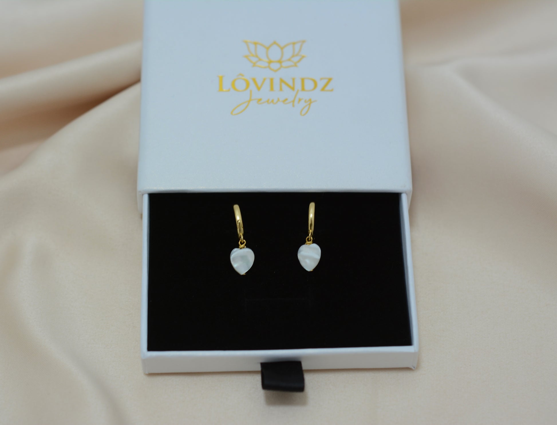 DESCRIPCIÒN Y MATERIAL: Aretes hechos en madre perla y chapa de oro de 24 kilates. Corazón de 8mm
