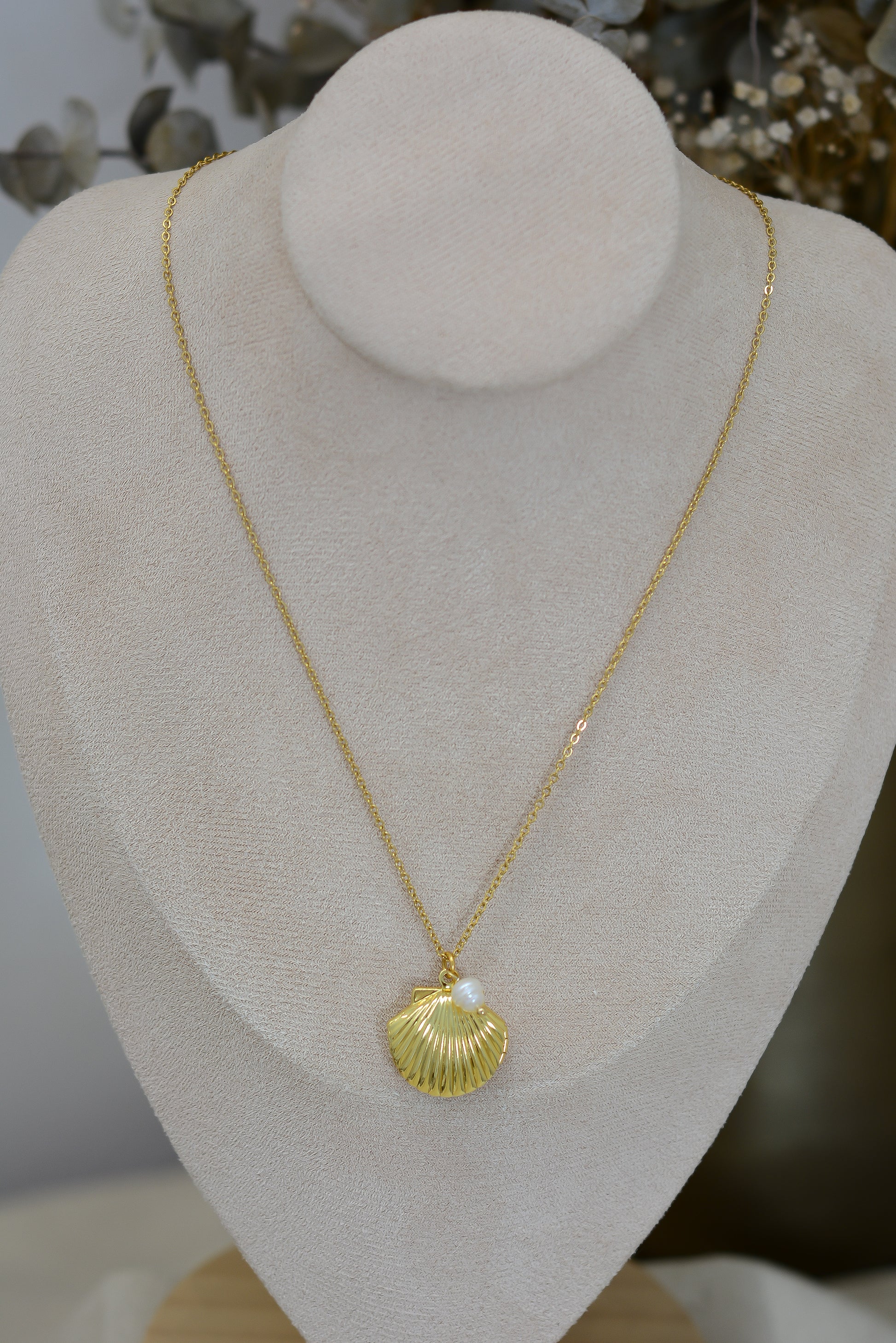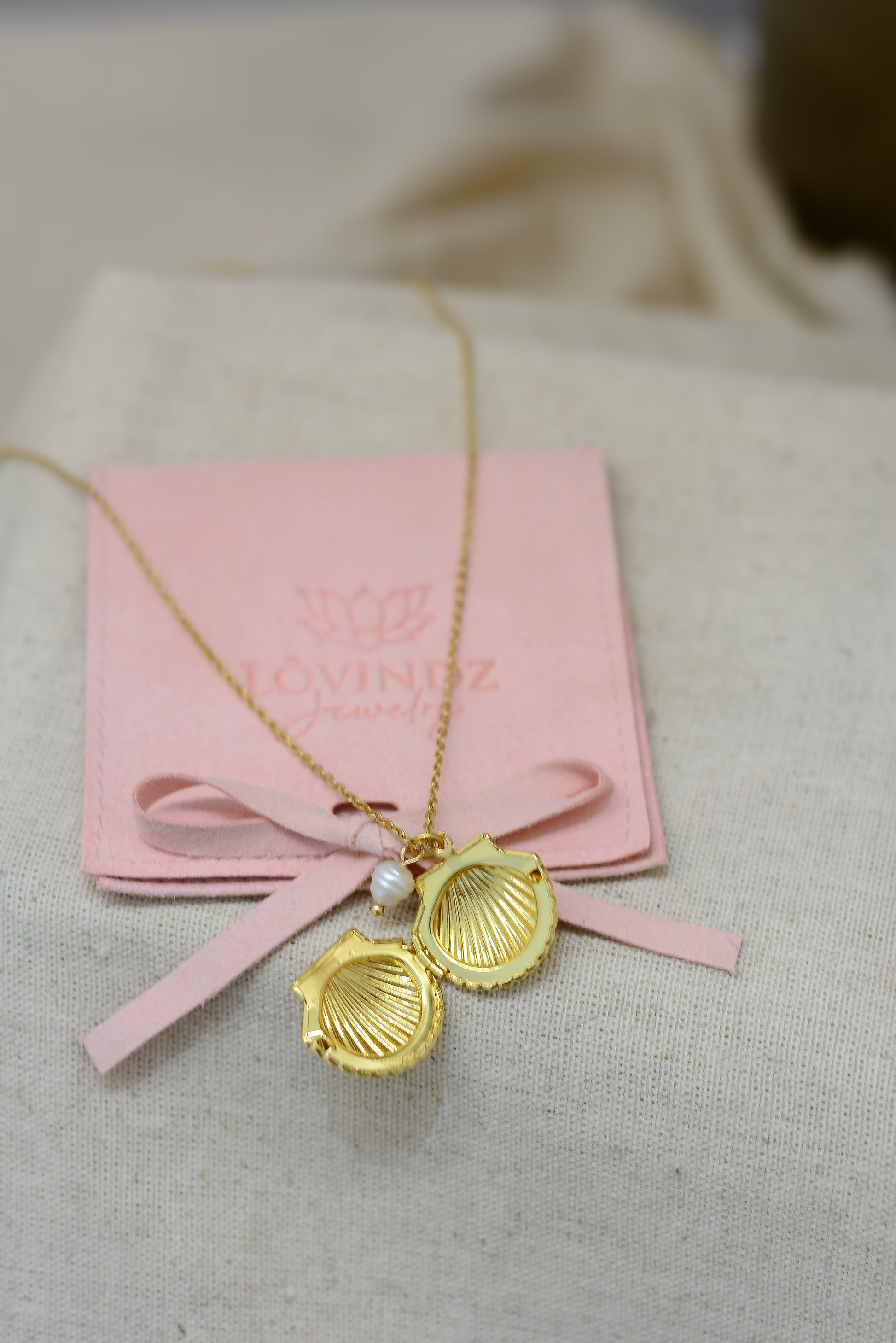 DESCRIPCIÓN: Cadena y relicario en forma de concha de mar, hecha en chapa de oro de 18 kilates y acero inoxidable con aplique de perla de rio. Largo de la cadena 45 cm.