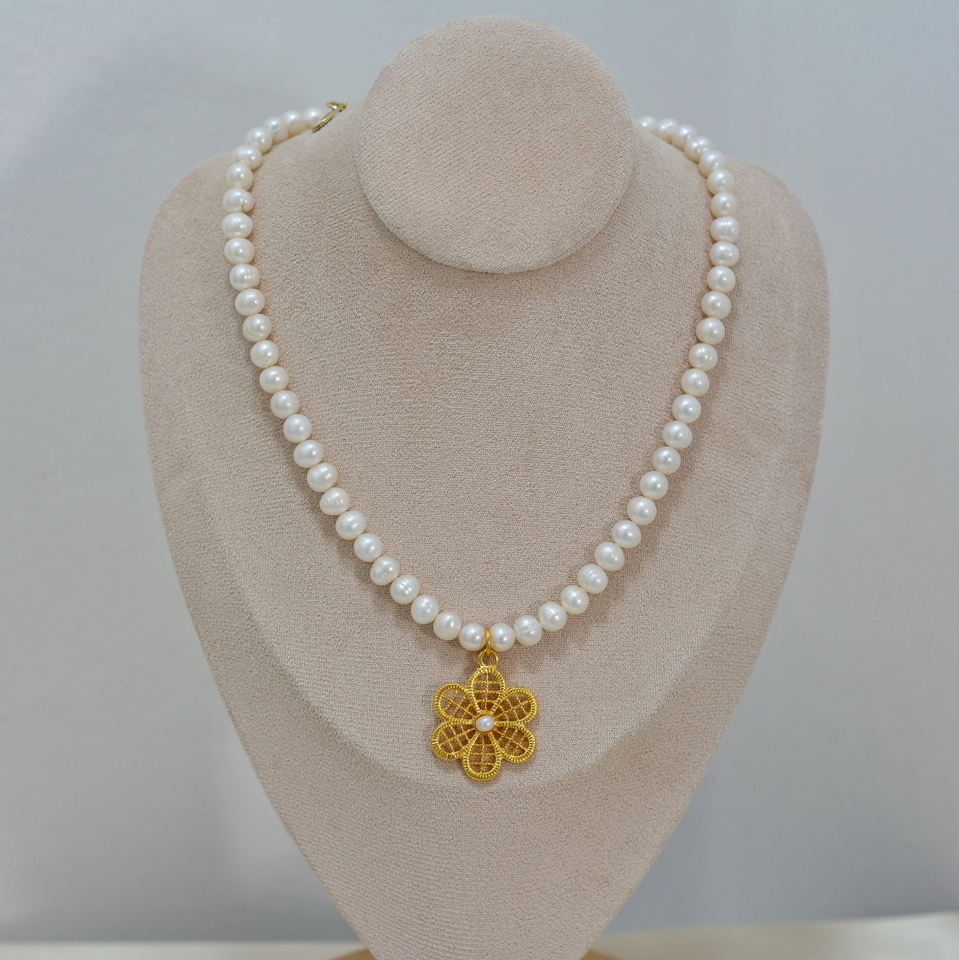 • DESCRIPCIÒN Y MATERIAL: Collar elaborado en perlas de río calidad AAA y chapa de oro de 24 kilates.