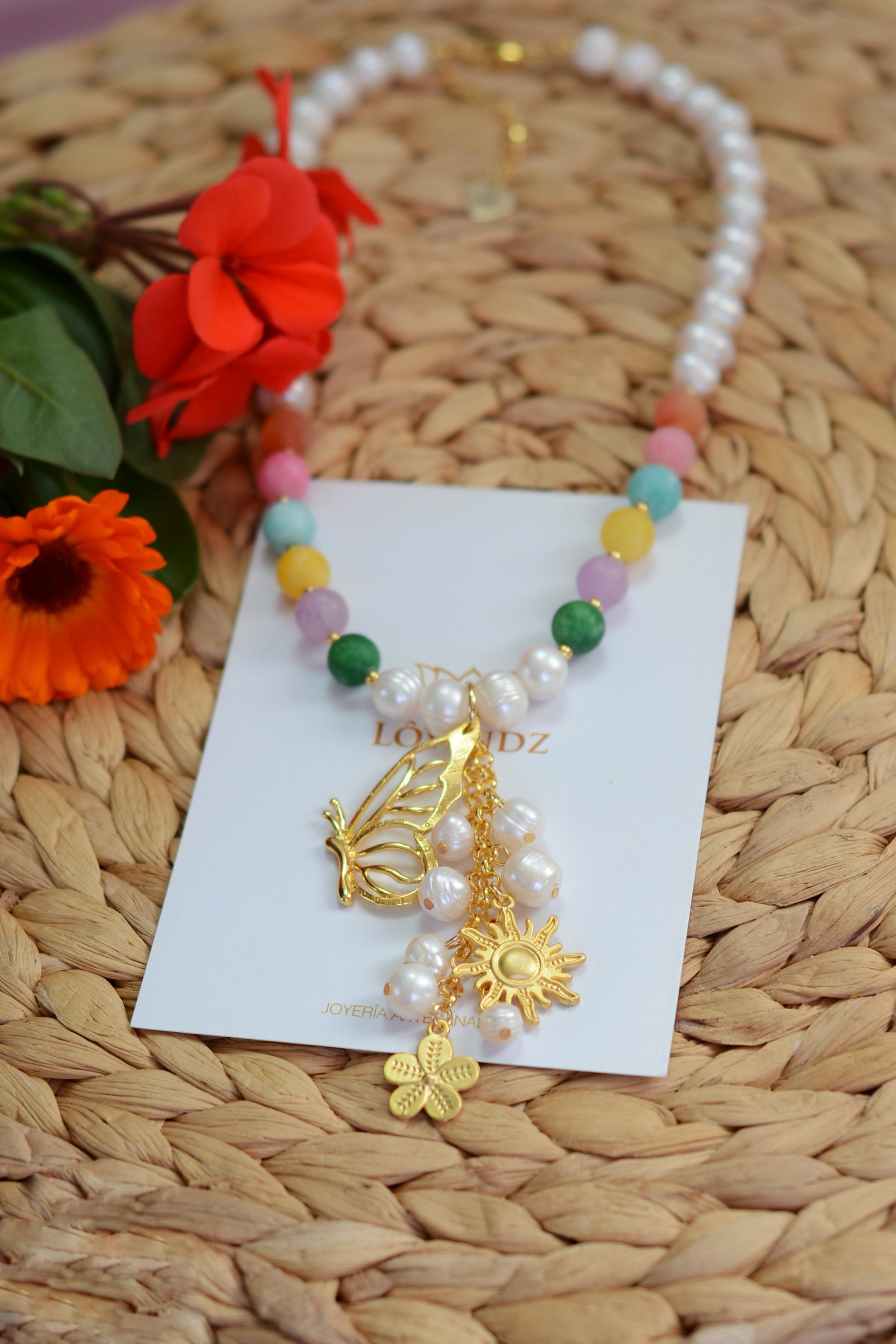 Collar 45 cm de largo; hecho en piedra jade mate, perla de río calidad premium y chapa de oro de 24kt.