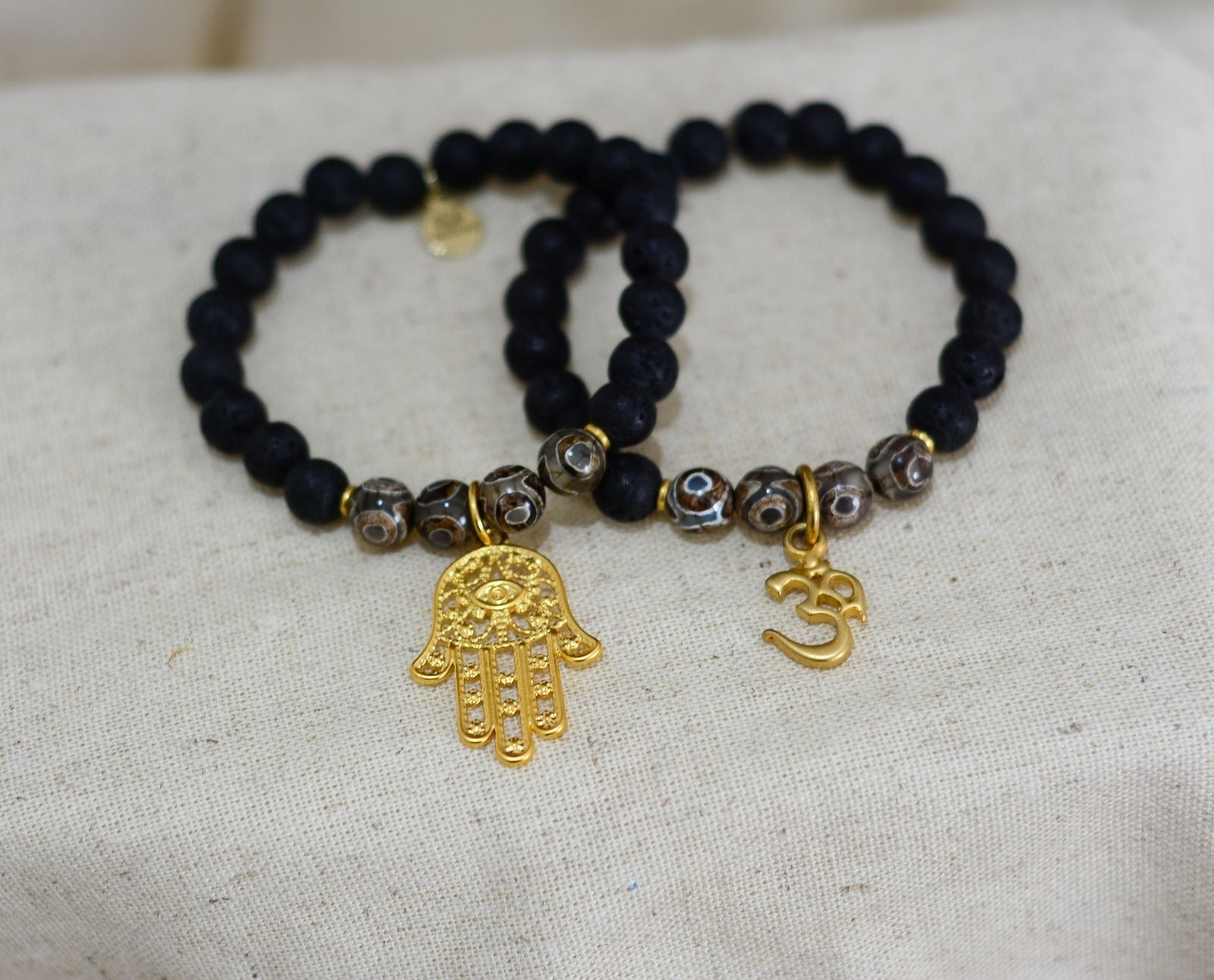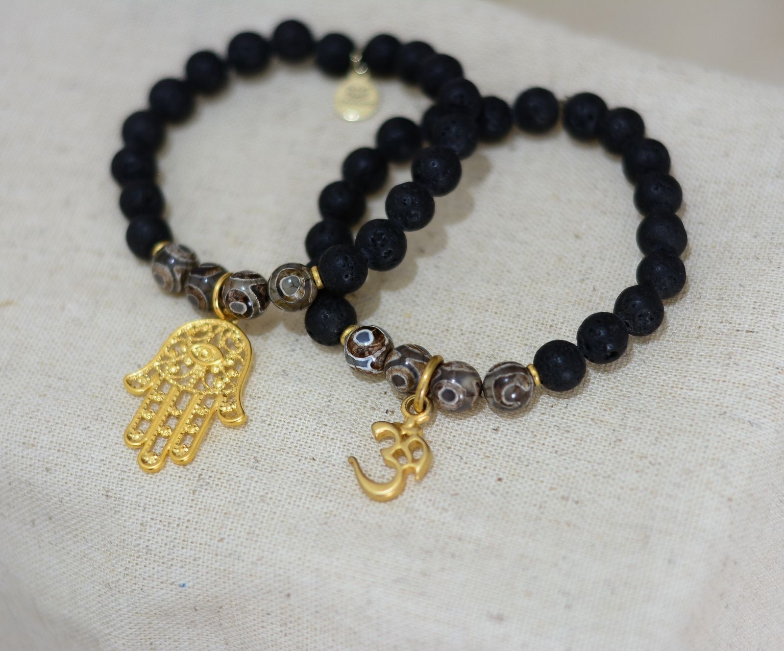 DESCRIPCIÓN: Juego de pulseras hechas en piedra lava, ágata de la India y chapa de oro de 24 kilates.