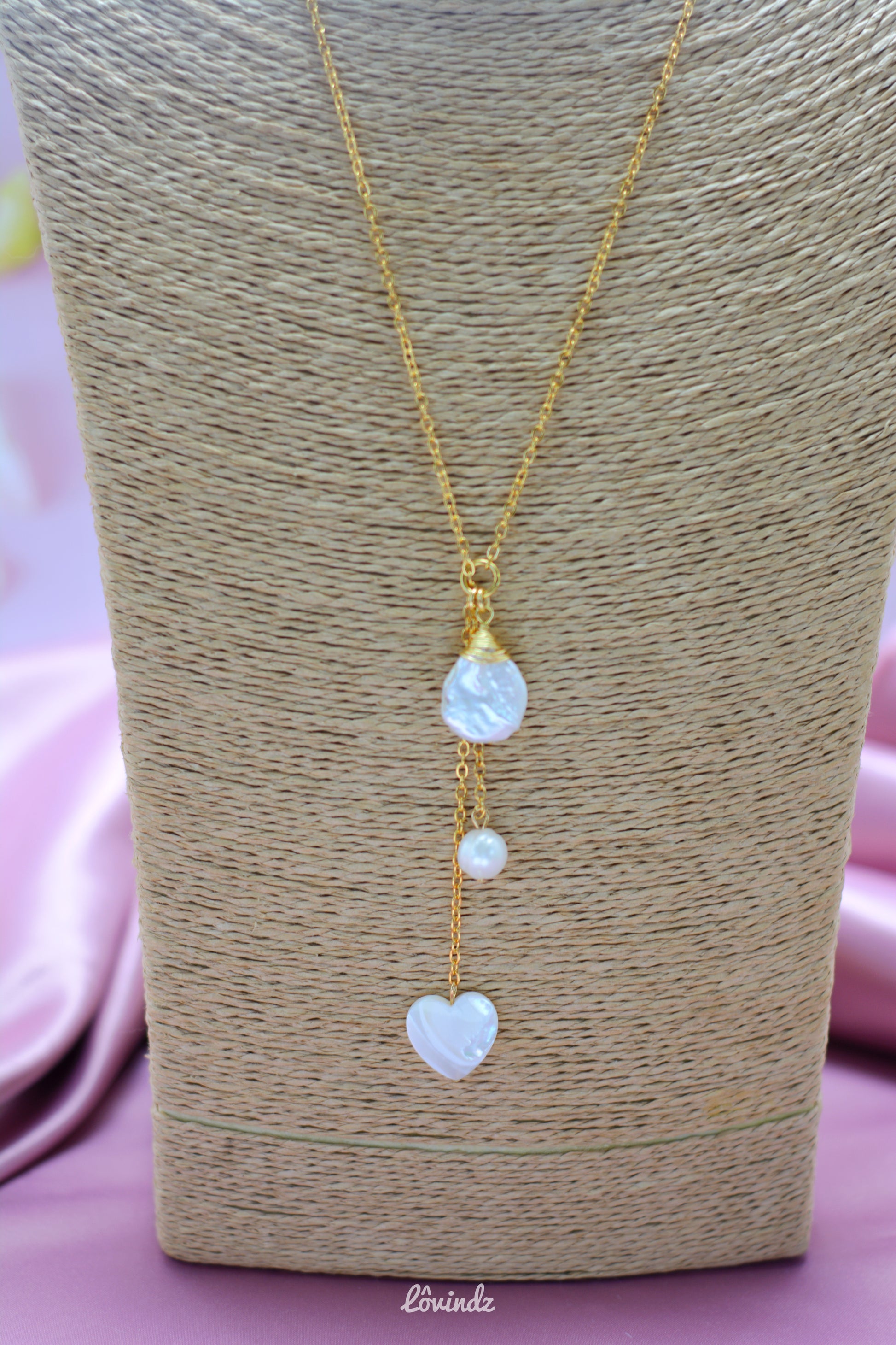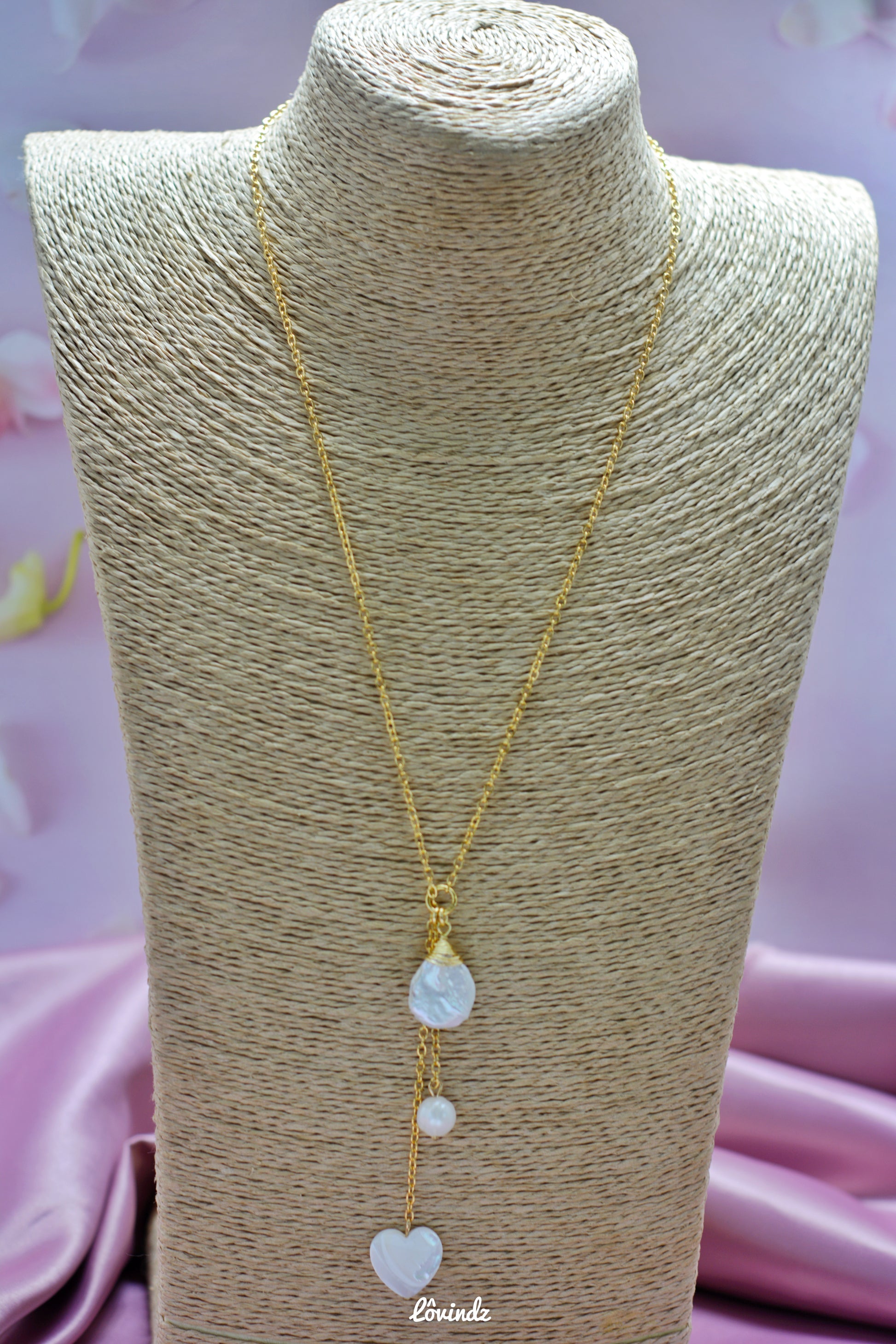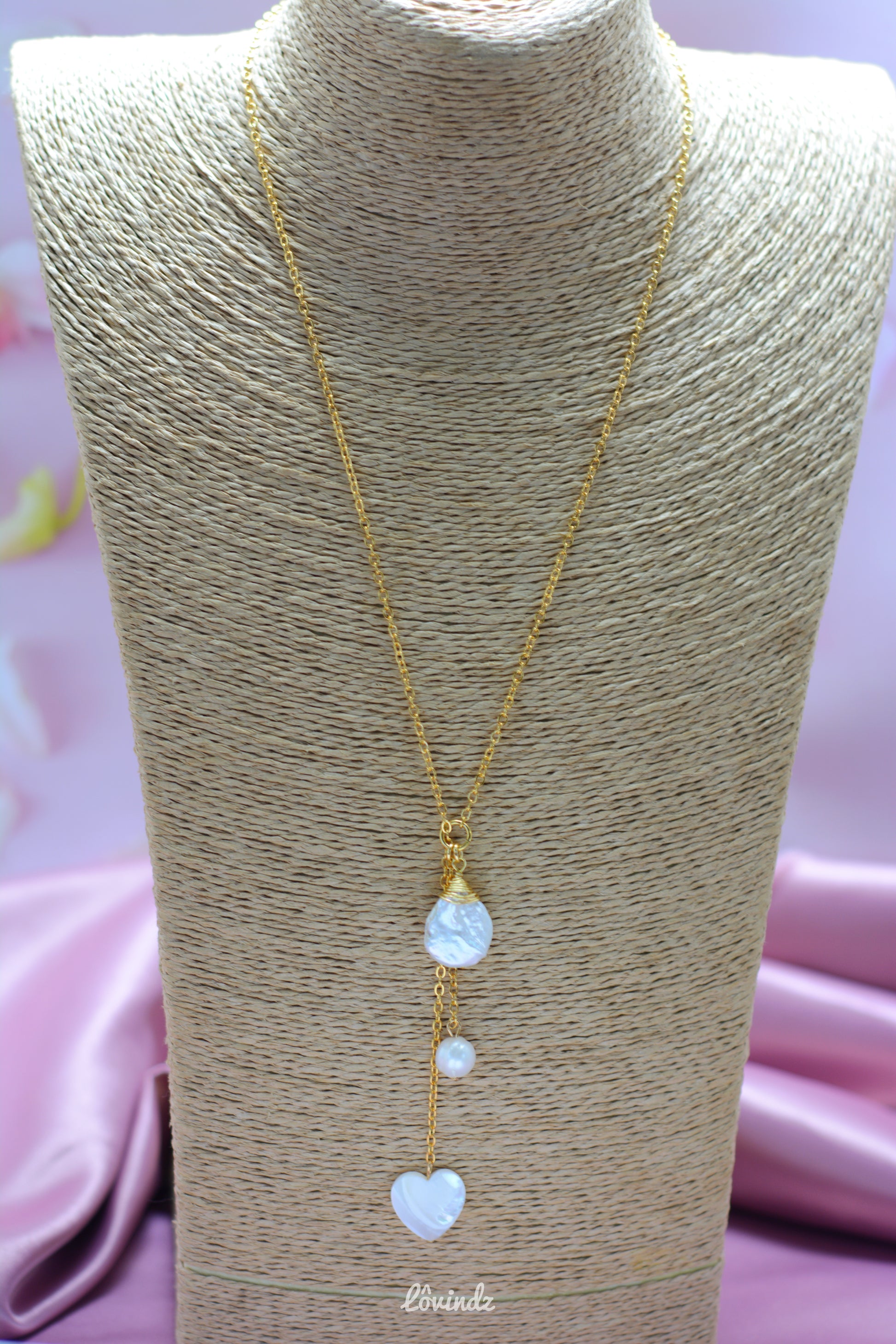 Cadena estilo corbatero, hecha en madre perla, perla de río y chapa de oro de 24 kilates.