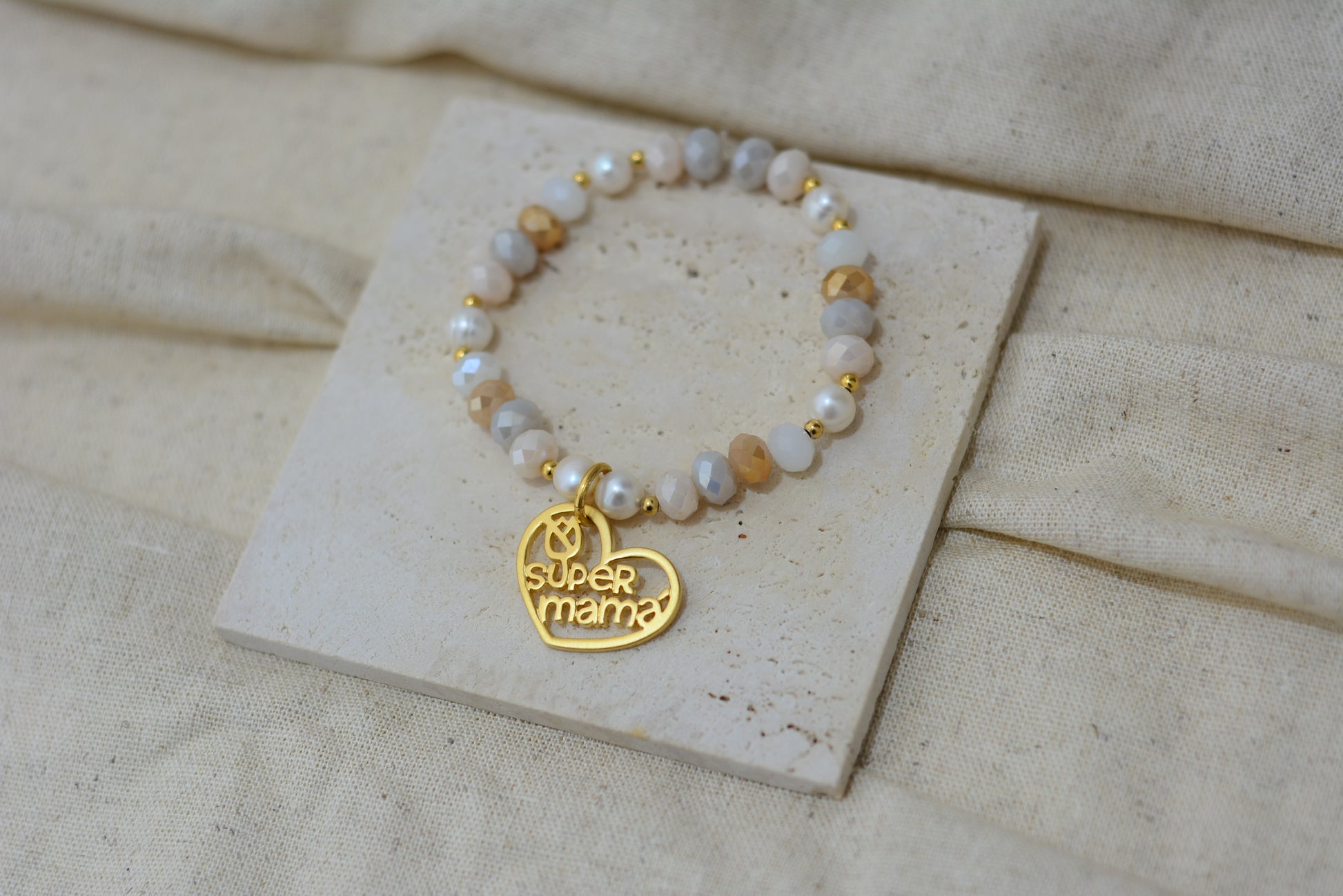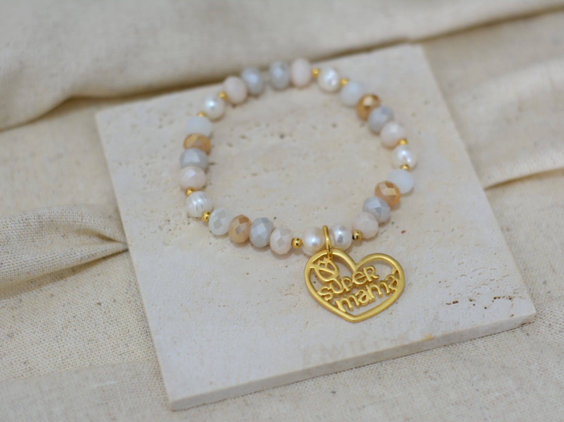 DESCRIPCIÓN: Pulsera hecha en cristales facetados, perlas de rio, y chapa de oro de 24 kilates.
