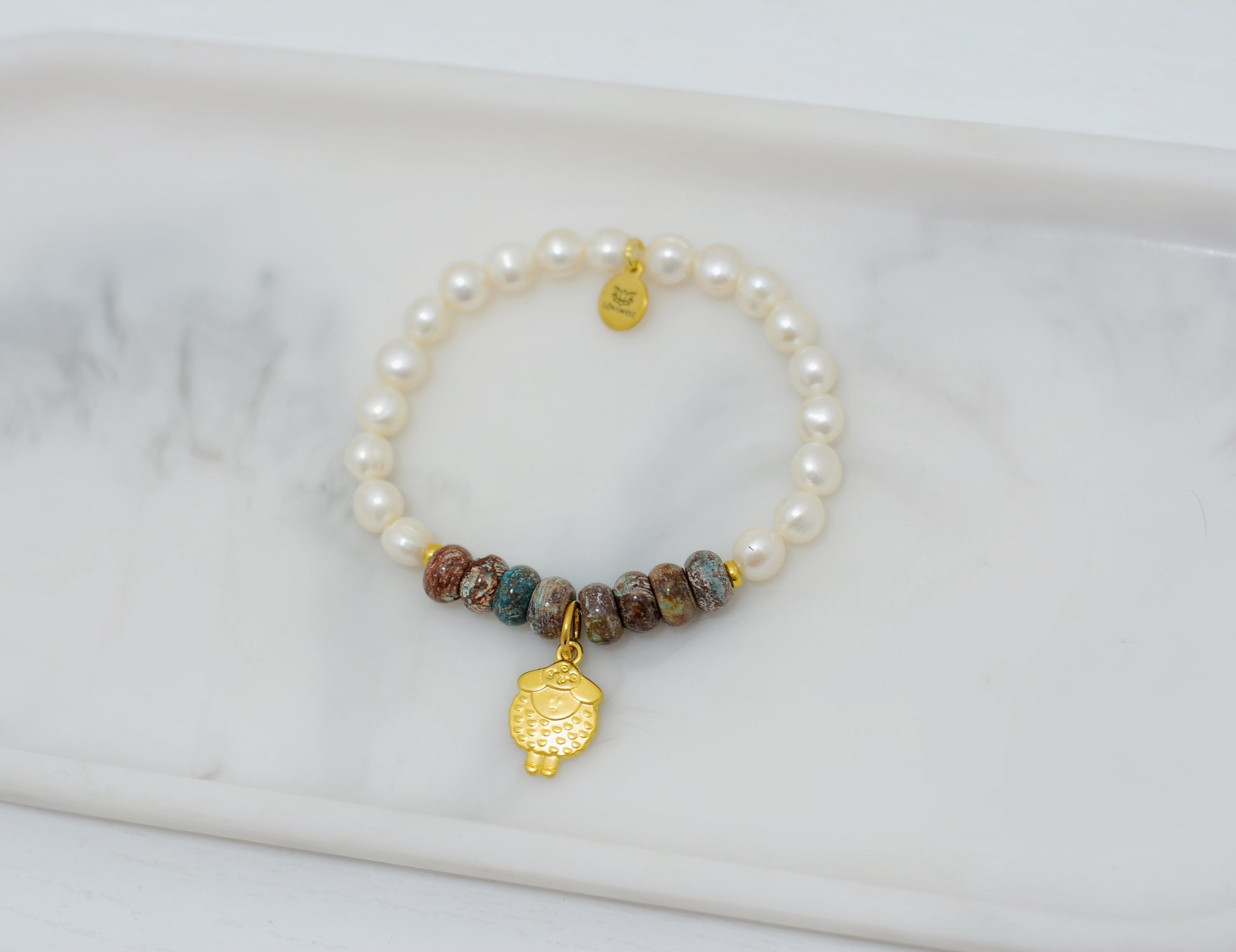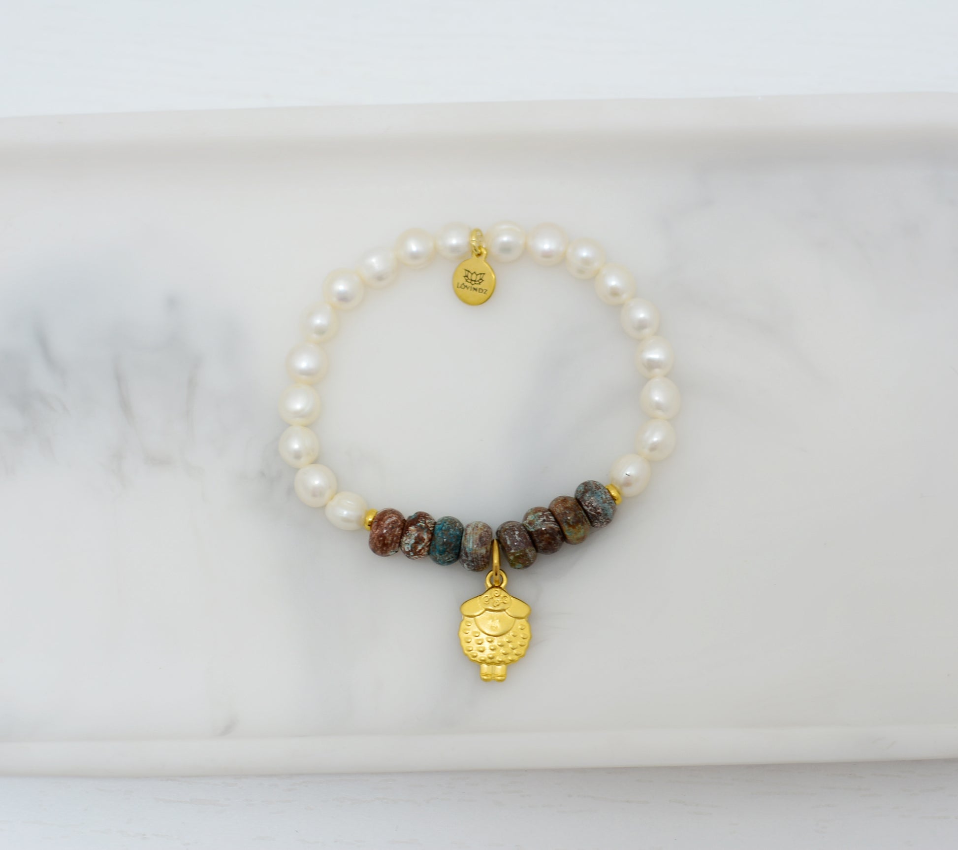 • DESCRIPCIÒN Y MATERIAL: Pulsera elaborada en perlas de río, piedra crisocola y chapa de oro de 24 kilates.