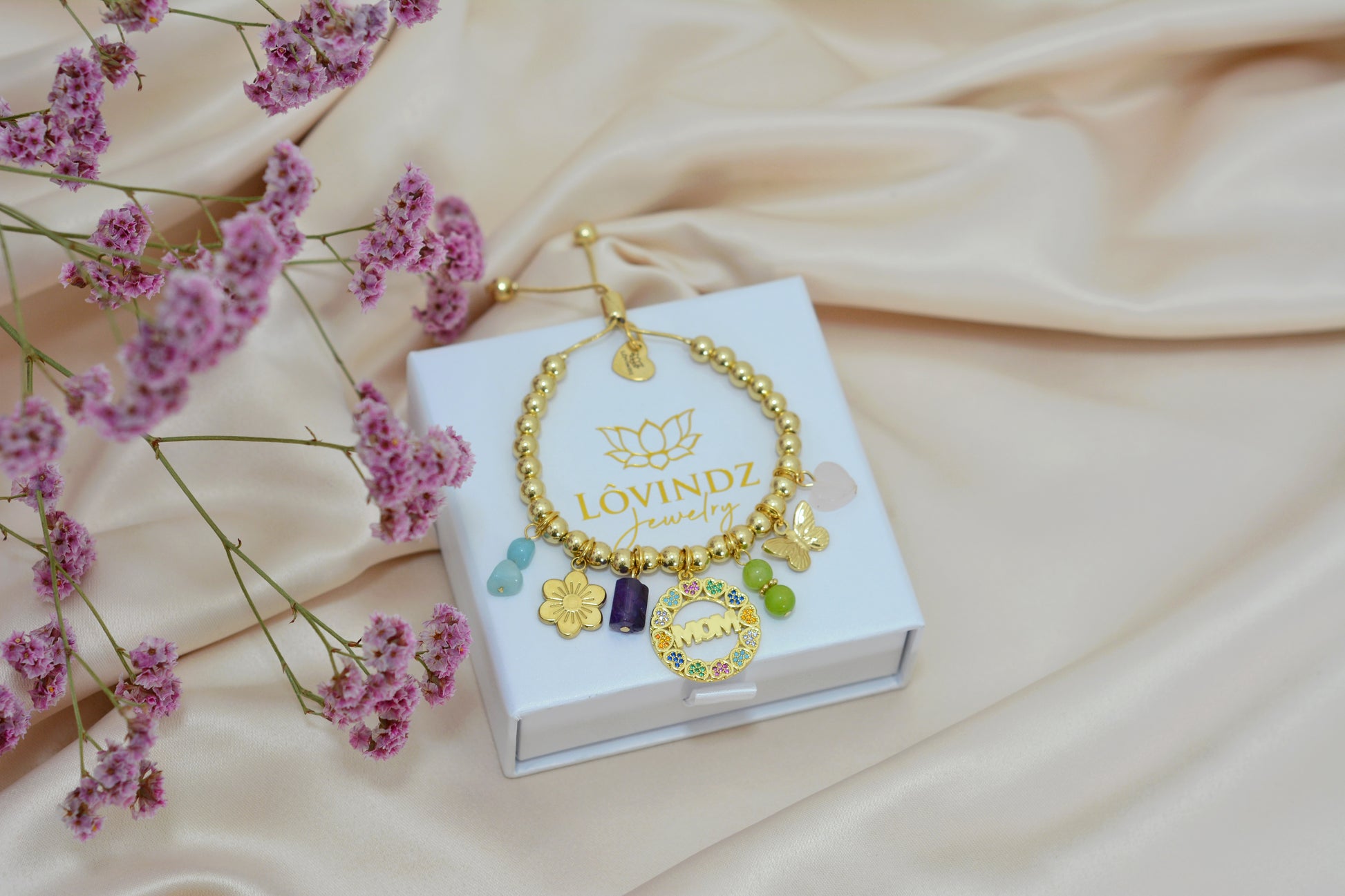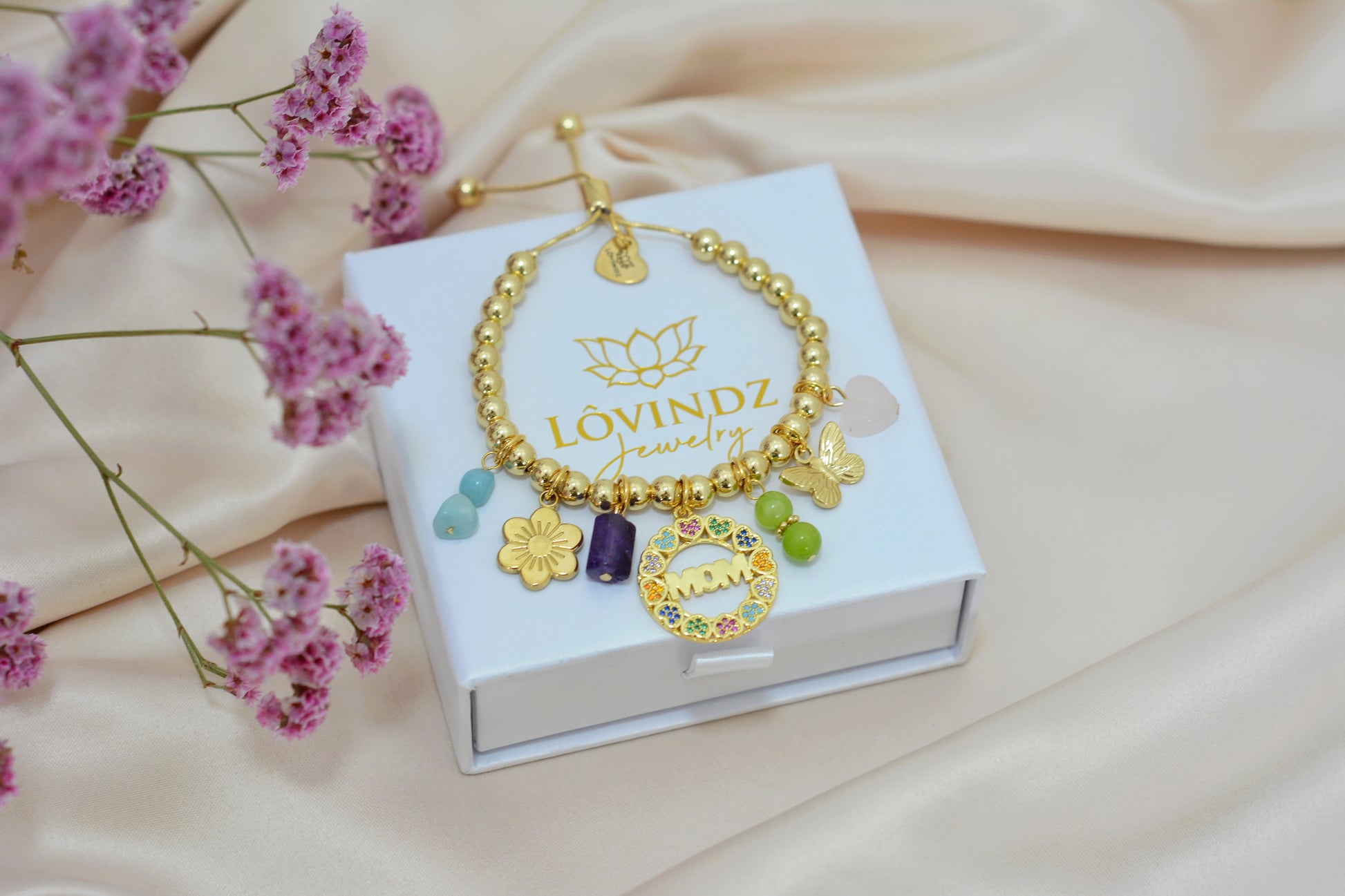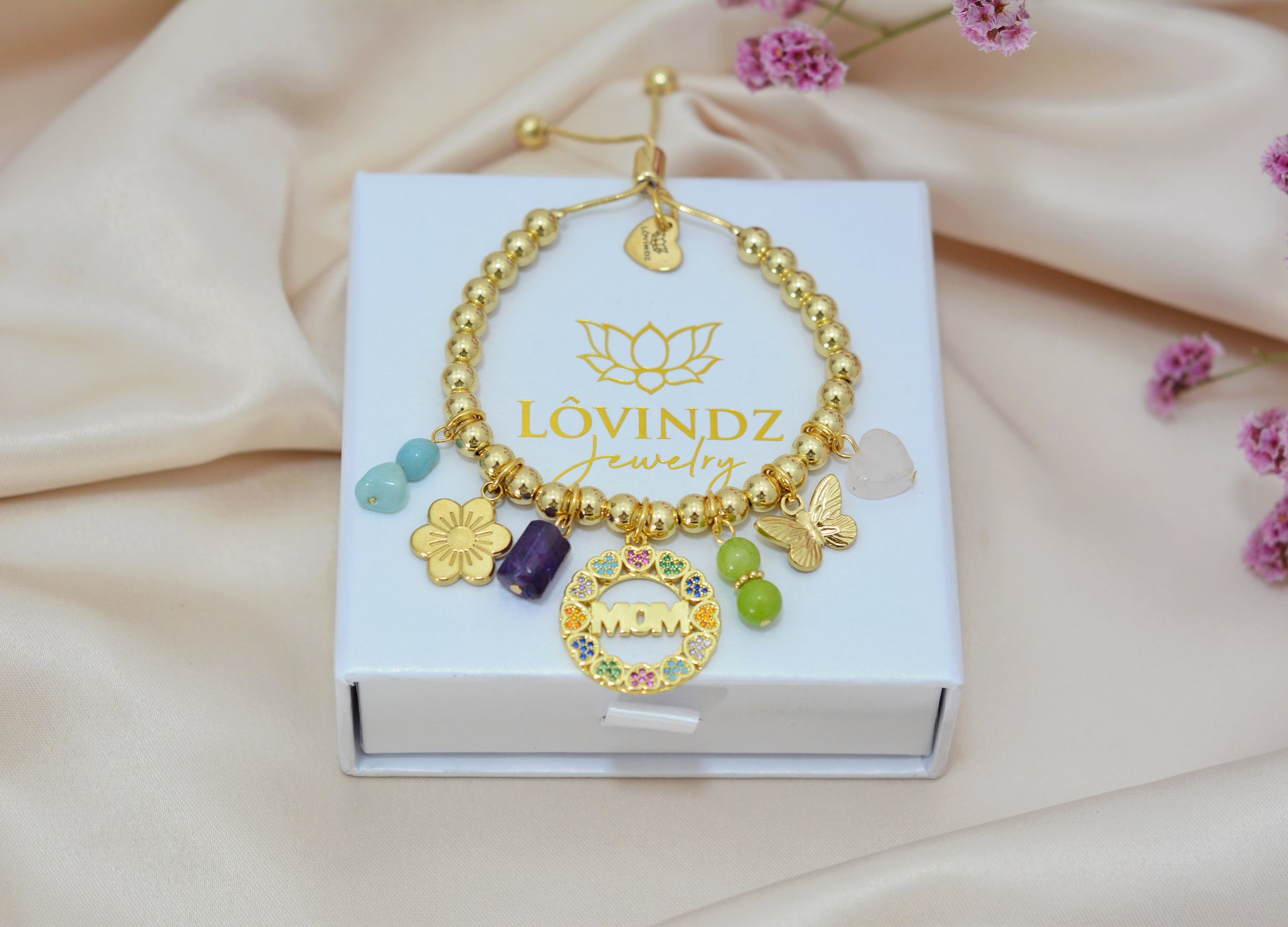 Pulsera ajustable; hecha en chapa de oro de 18 y 24 kilates, zirconias, cuarzo rosa, cuarzo amatista, piedra amazonita y jade.