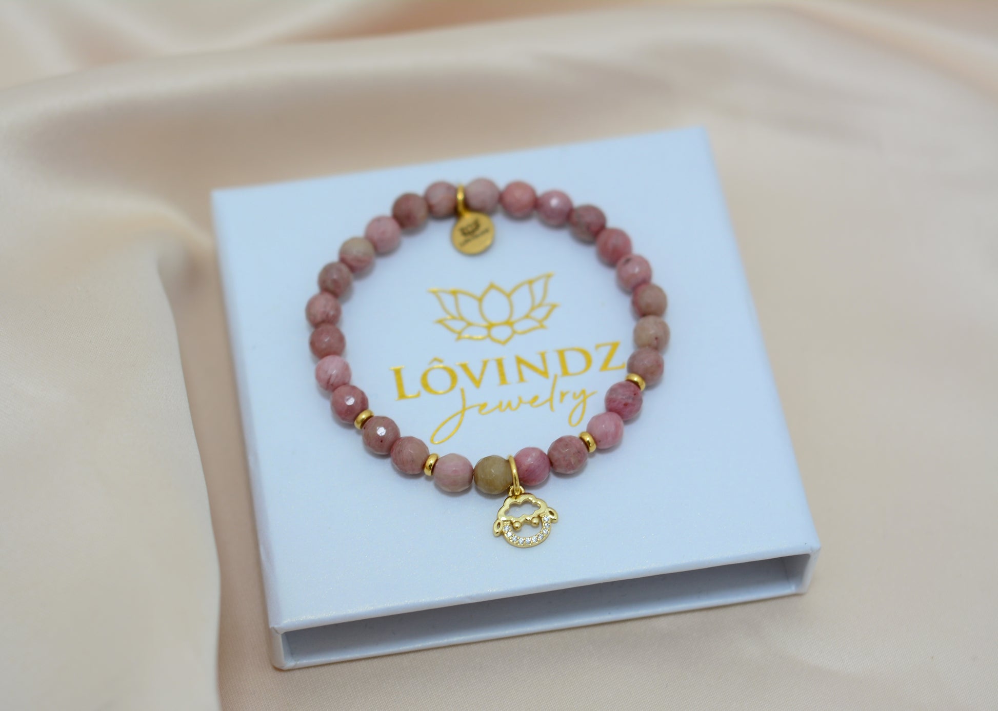 Pulsera hecha en piedra rodonita facetada, zirconia cubica y chapa de oro de 24 kilates.