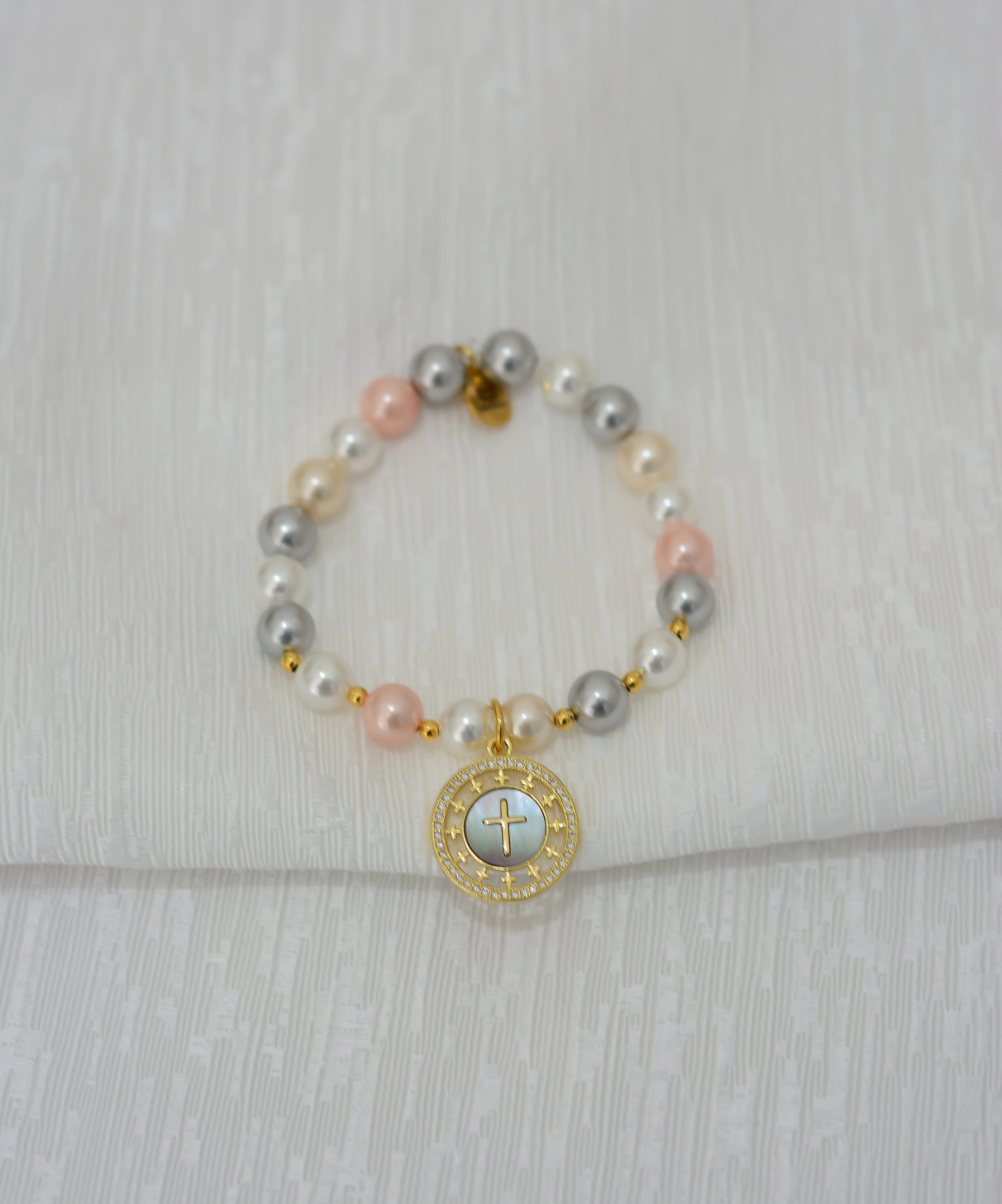 DESCRIPCIÓN: Pulsera hecha en cuentas de polvo de madre perla, zirconias, madre perla y chapa de oro de 18 kilates. * El tono de la madre perla en el dije puede variar en intensidad entre blanco, tornasol y gris. Dado que es un elemento natural no hay un dije igual a otro.