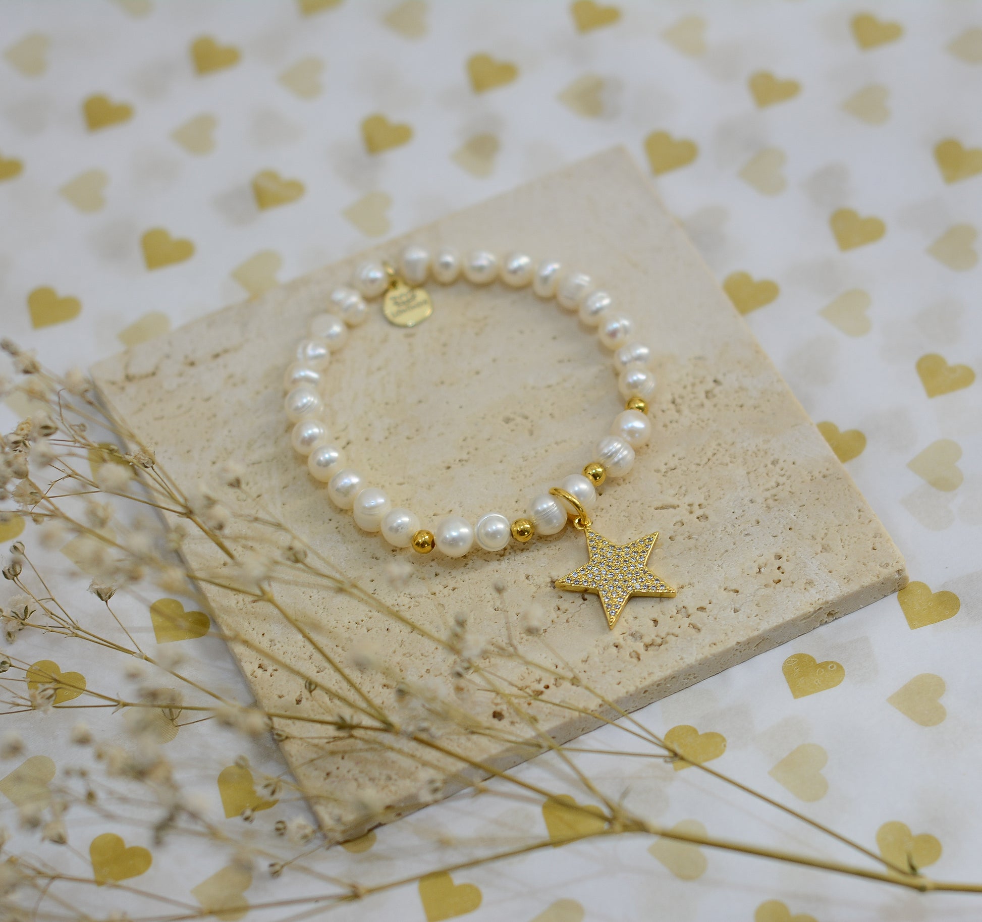 DESCRIPCIÓN: Pulsera hecha en perla de rio, microzirconias y chapa de oro de 18 y 24 kilates.