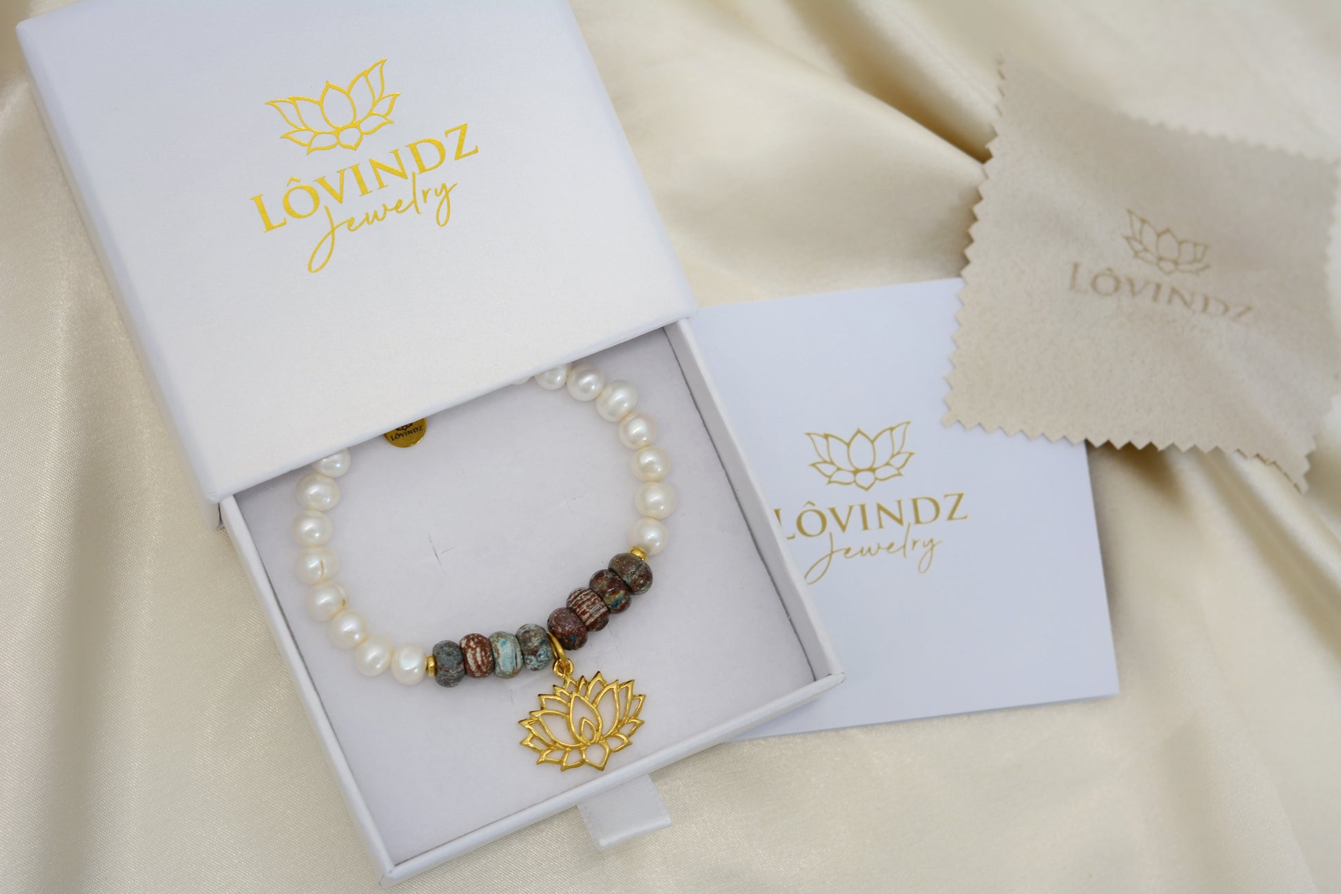 • DESCRIPCIÒN Y MATERIAL: Pulsera flor de loto elaborada en piedra crisocola, perla de río calidad AAA de 8 mm y chapa de oro de 24 kilates.