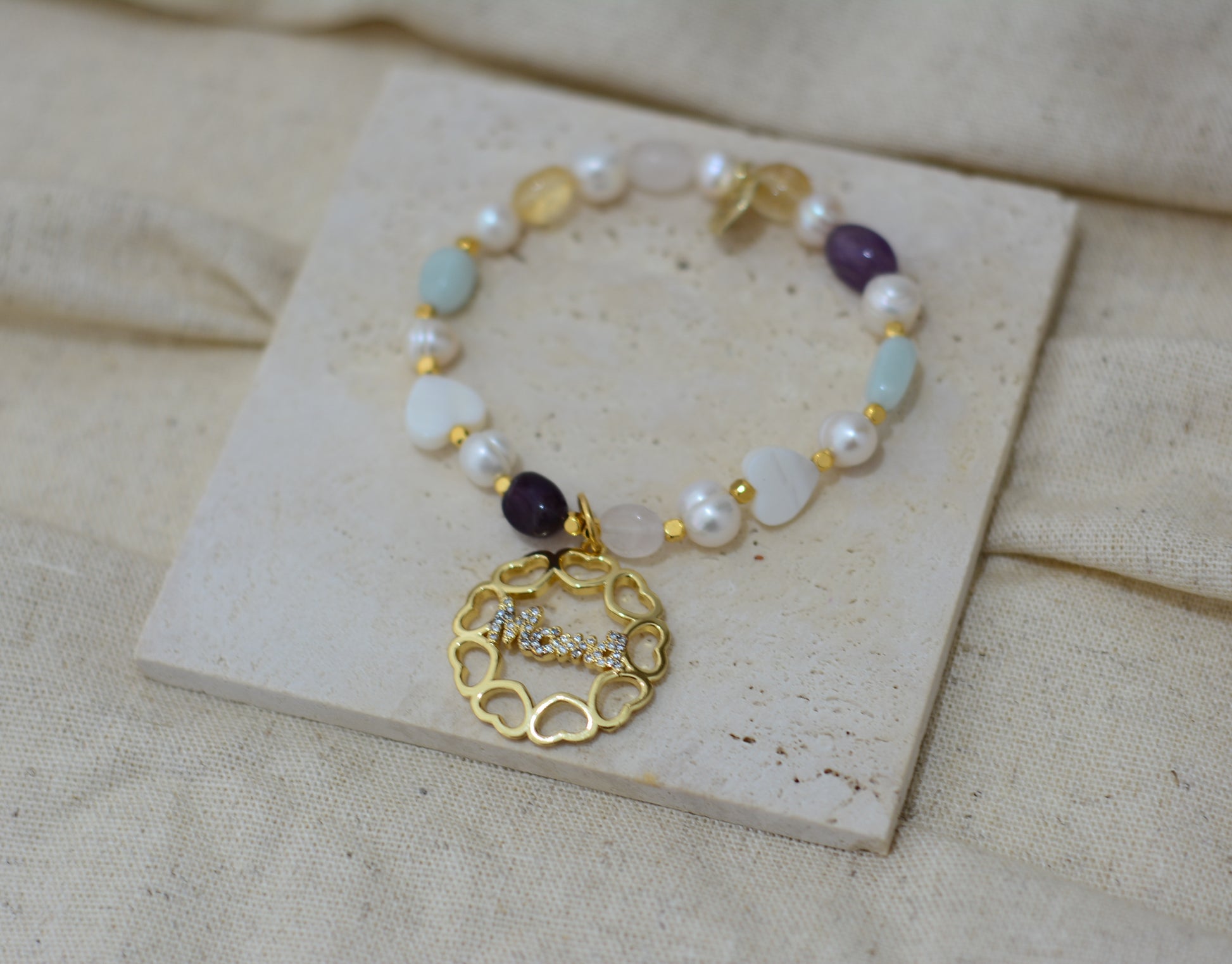 DESCRIPCIÓN: Pulsera hecha en cuarzos, perla de rio, zirconias y chapade oro de 24 kilates.