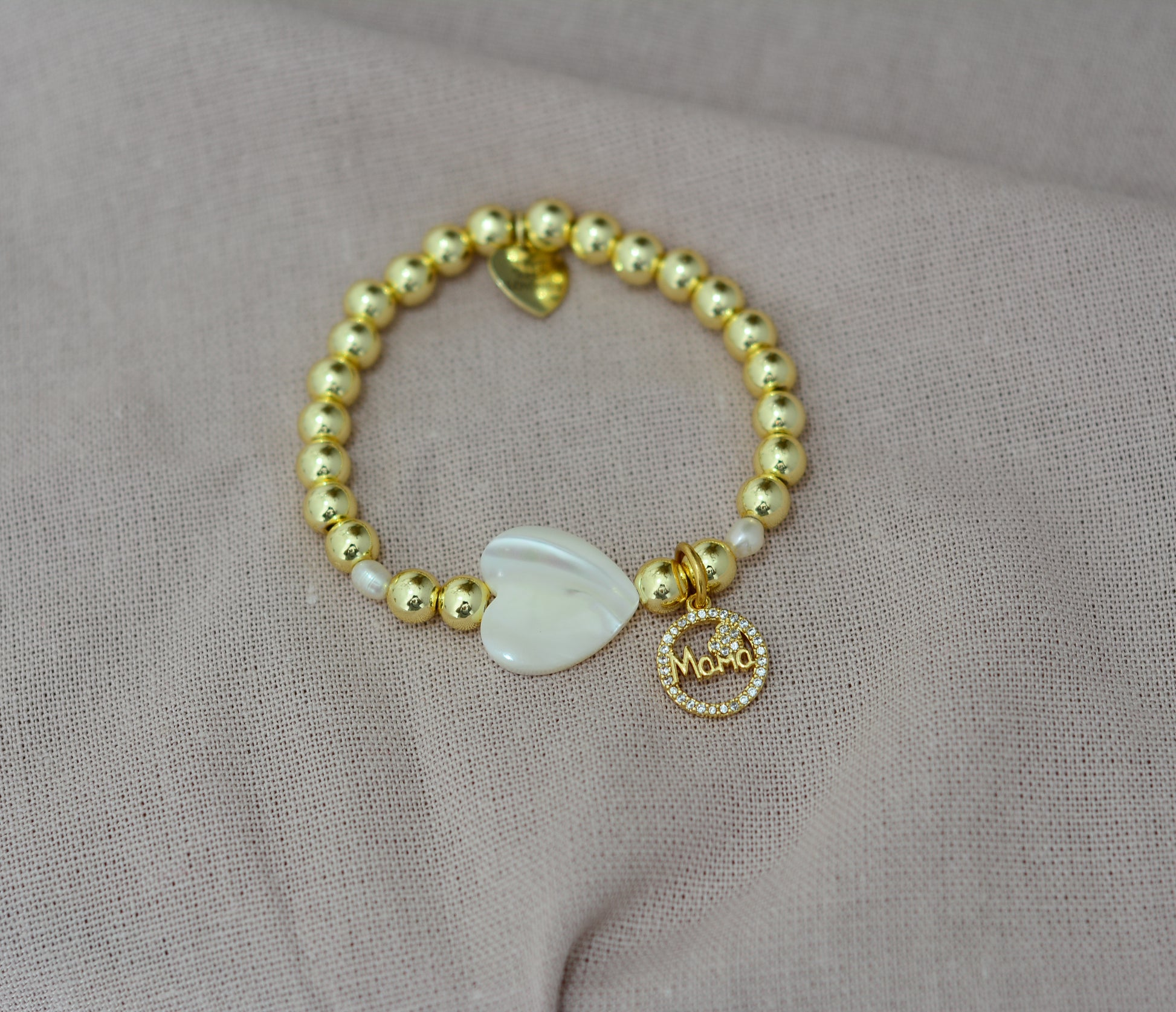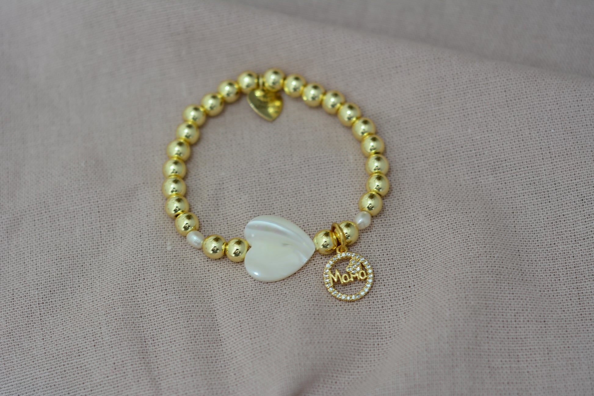 DESCRIPCIÓN: Pulsera hecha en madre perla, perla de rio, hematita, zirconias y chapa de oro de 24 kilates.