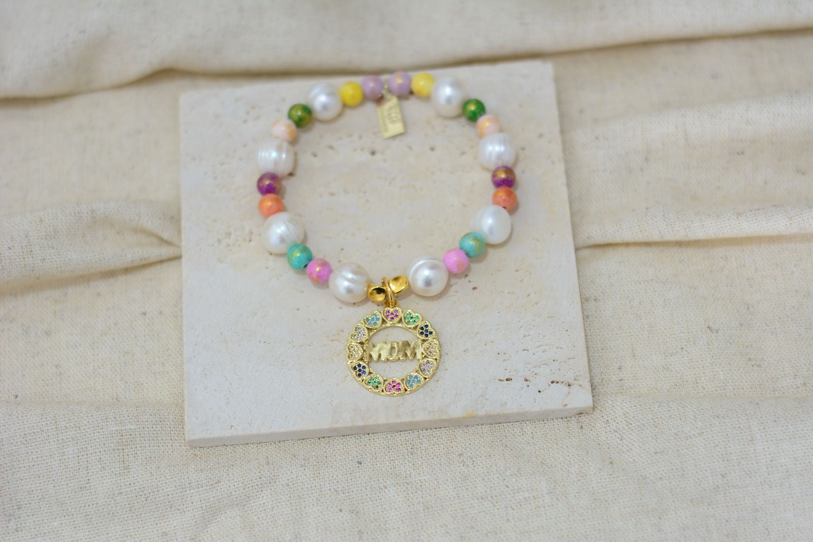 DESCRIPCIÓN: Pulsera hecha en perla de rio, piedras jade multicolor, zirconias y chapa de oro de 24 kilates.