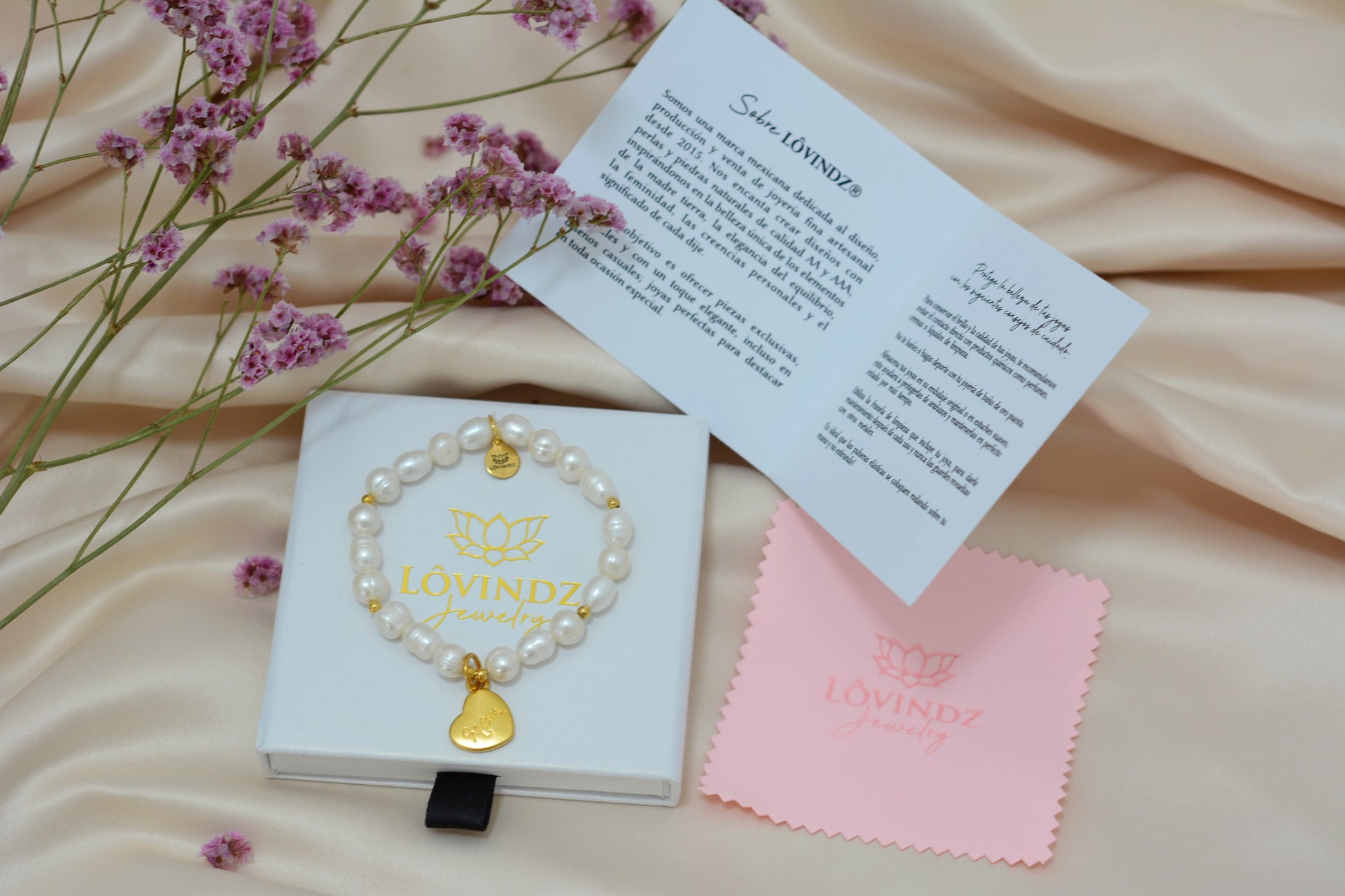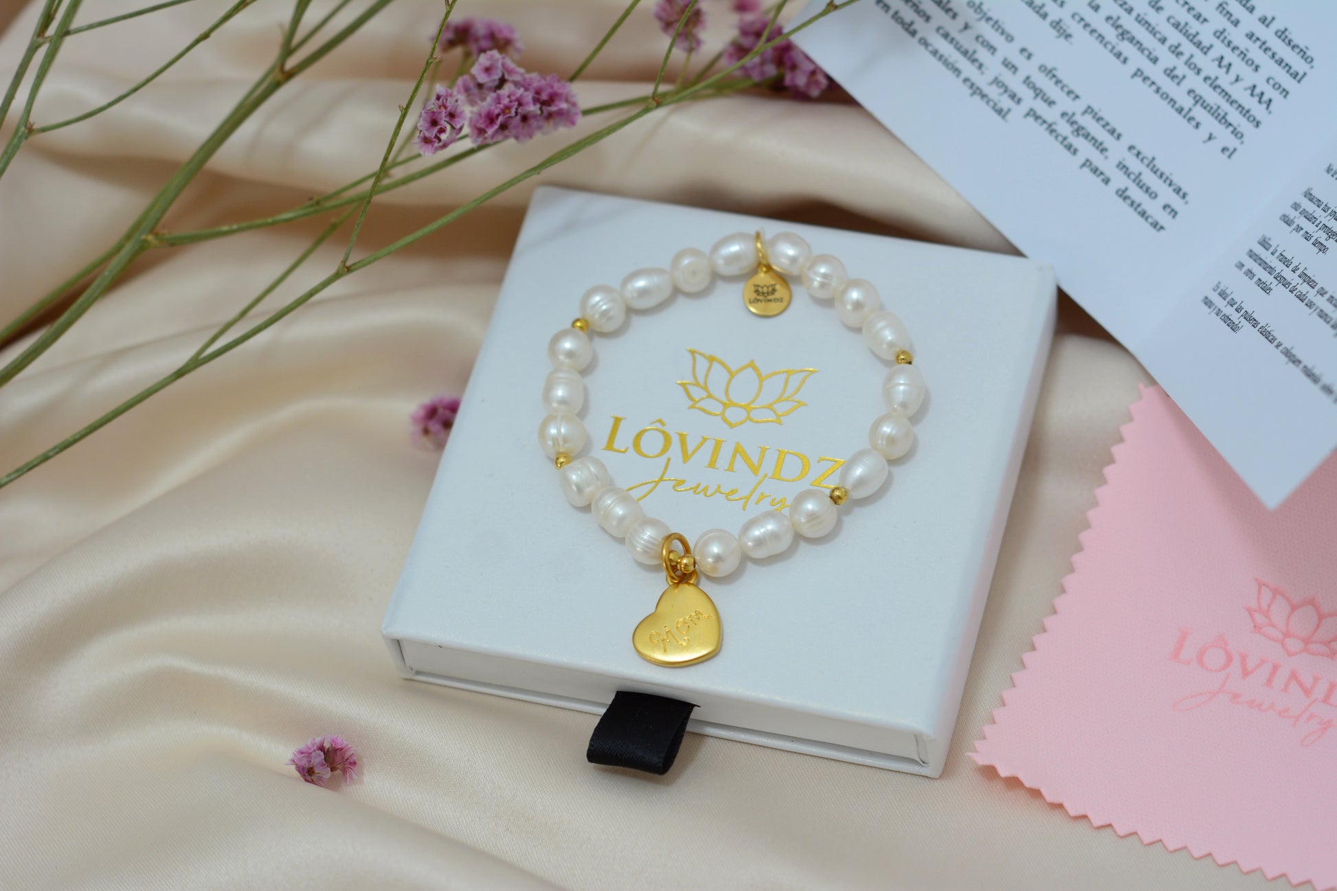 Pulsera hecha en perla de rio y chapa de oro de 24 kilates.