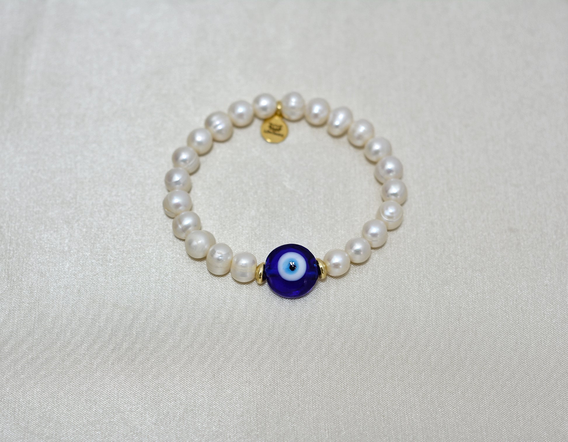 • DESCRIPCIÒN Y MATERIAL: Pulsera elaborada en perla de río calidad AAA de 8 mm, ojo turco de murano y chapa de oro de 24 kilates.