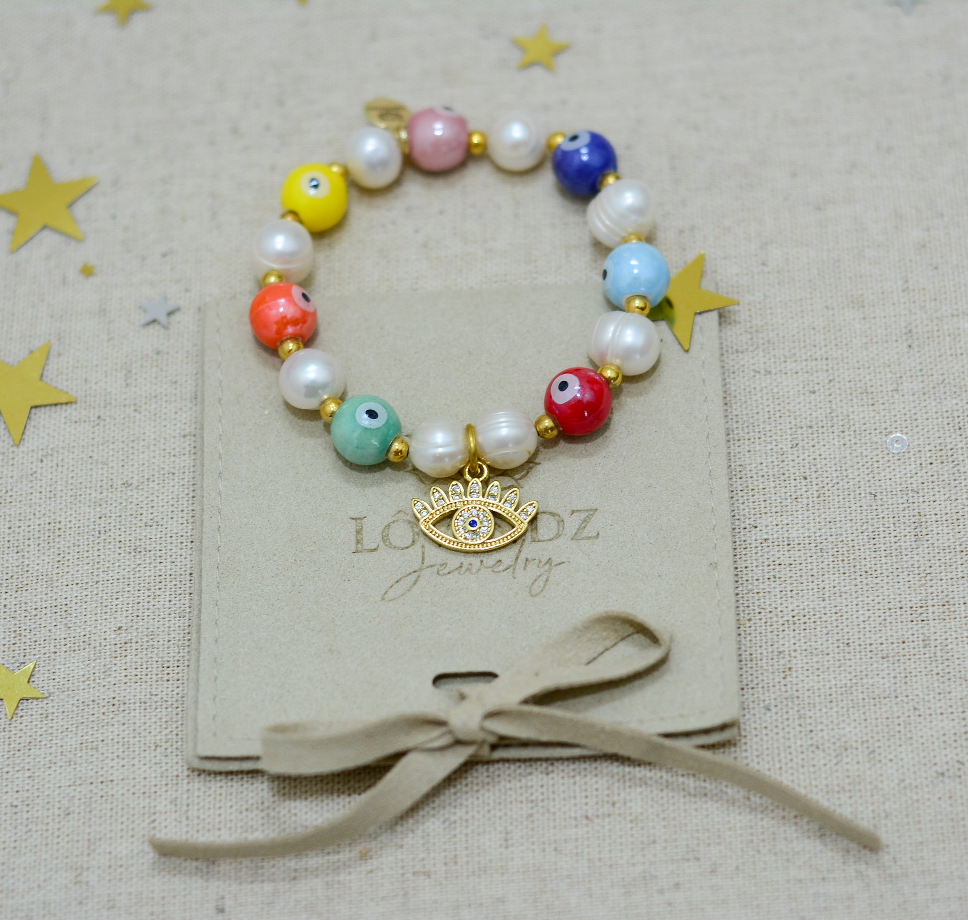 DESCRIPCIÓN: Pulsera hecha en perla de rio calidad AAA, porcelana y chapa de oro de 24 kilates.