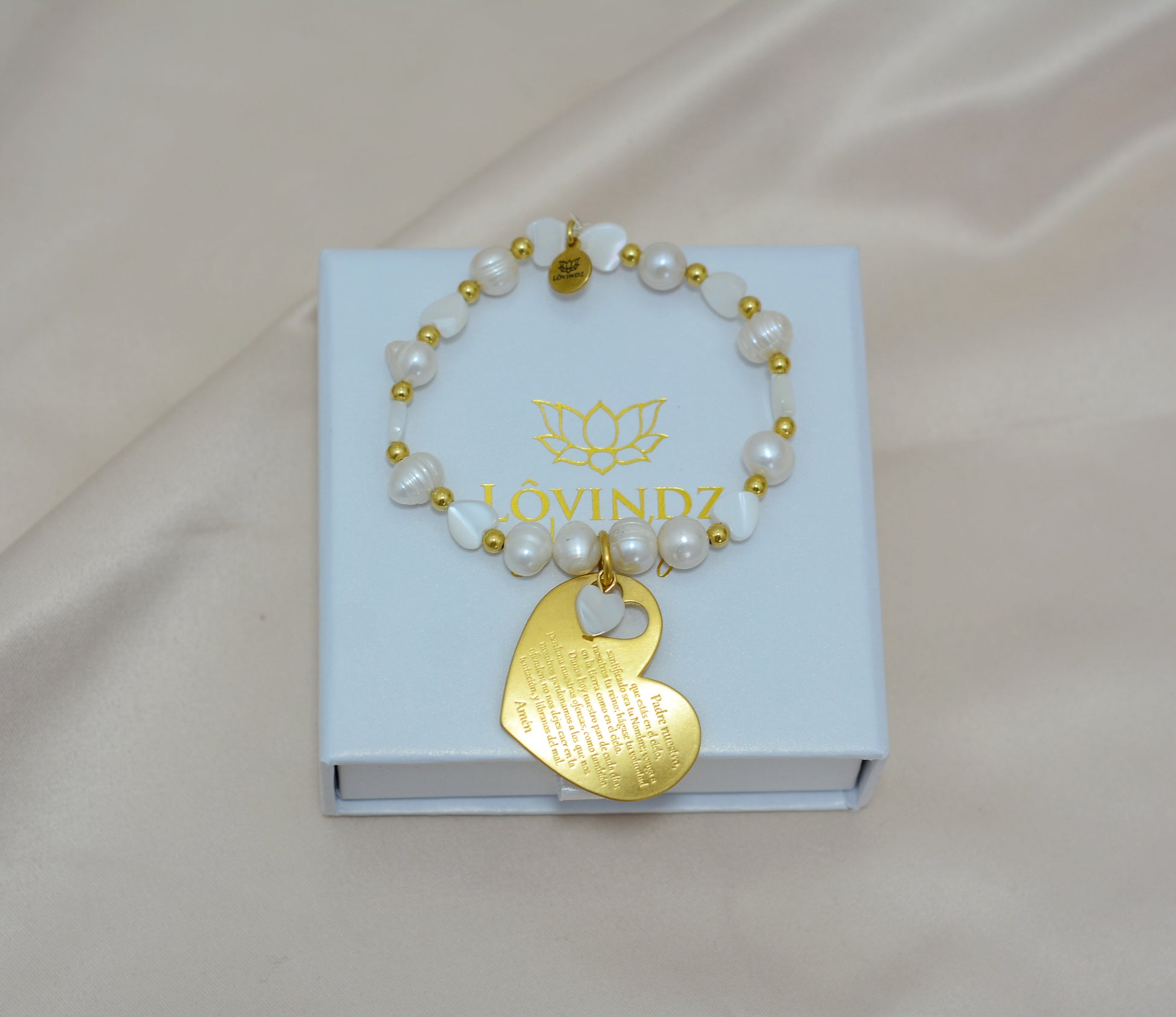 DESCRIPCIÒN Y MATERIAL: Pulsera hecha en perla de rìo, madre perla y chapa de oro de 24 kilates.