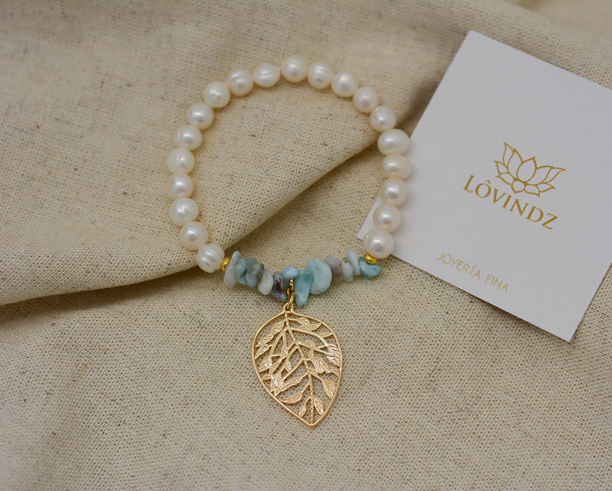 DESCRIPCIÓN: Pulsera hecha en perla de rio calidad premium, piedra laminar y chapa de oro de 24 y 18 kilates.