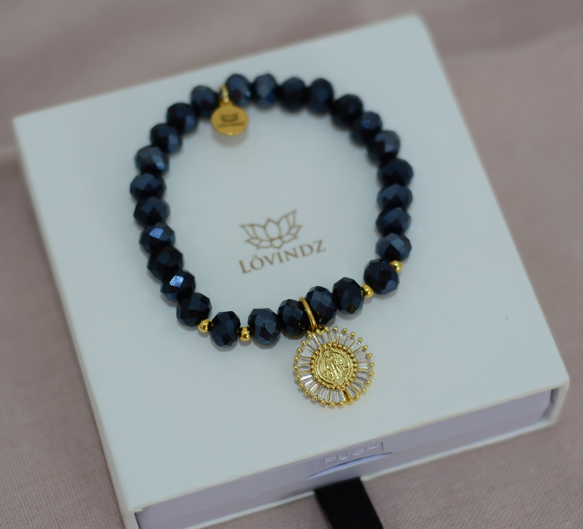 DESCRIPCIÓN: Pulsera hecha en cristal facetado, zirconias y chapa de oro de 24 y 18 kilates