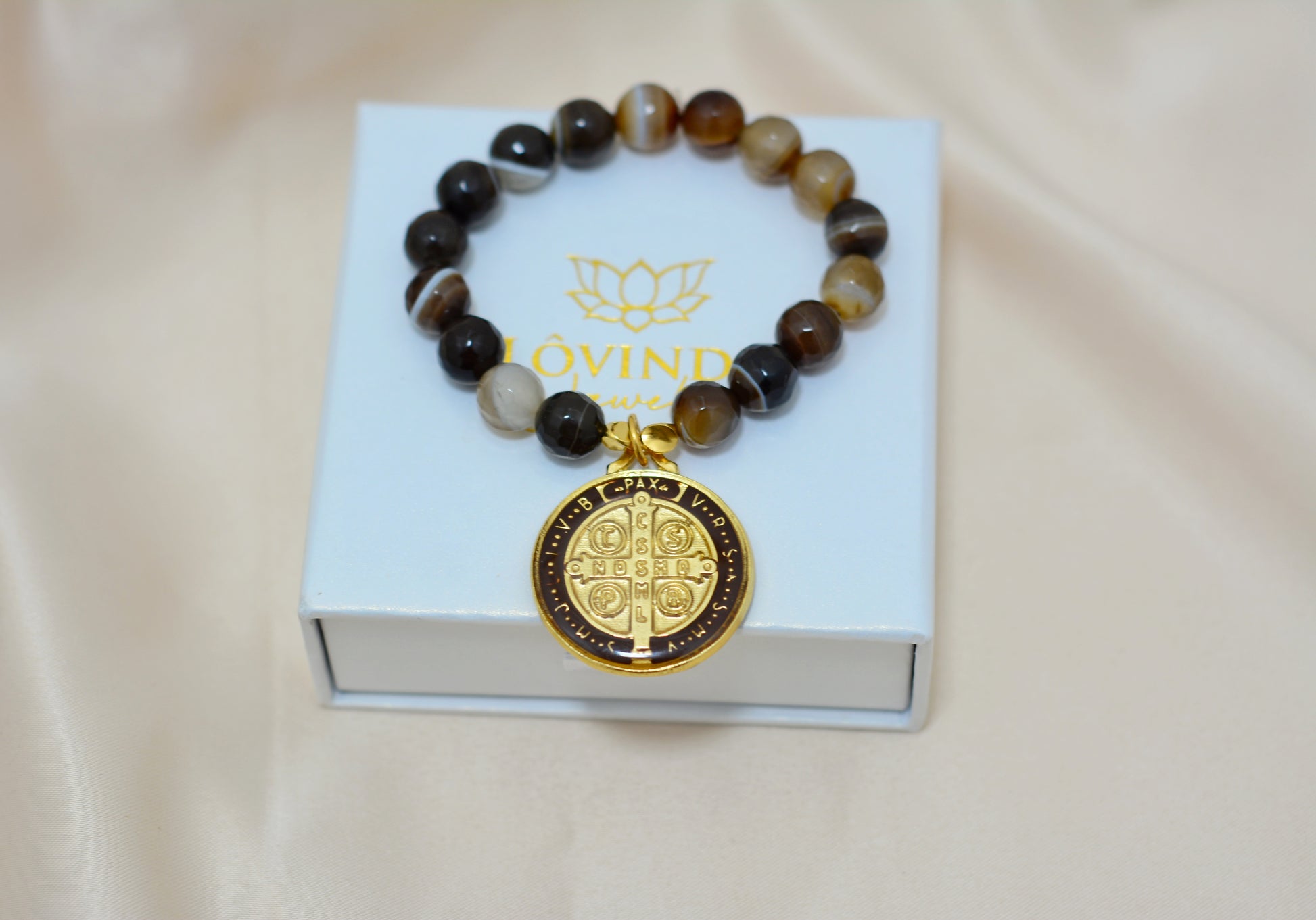 • DESCRIPCIÒN Y MATERIAL: Pulsera medalla San Benito, hecha en piedra ágata de Brasil tamaño grande con chapa de oro de 24 y 18 kilates.