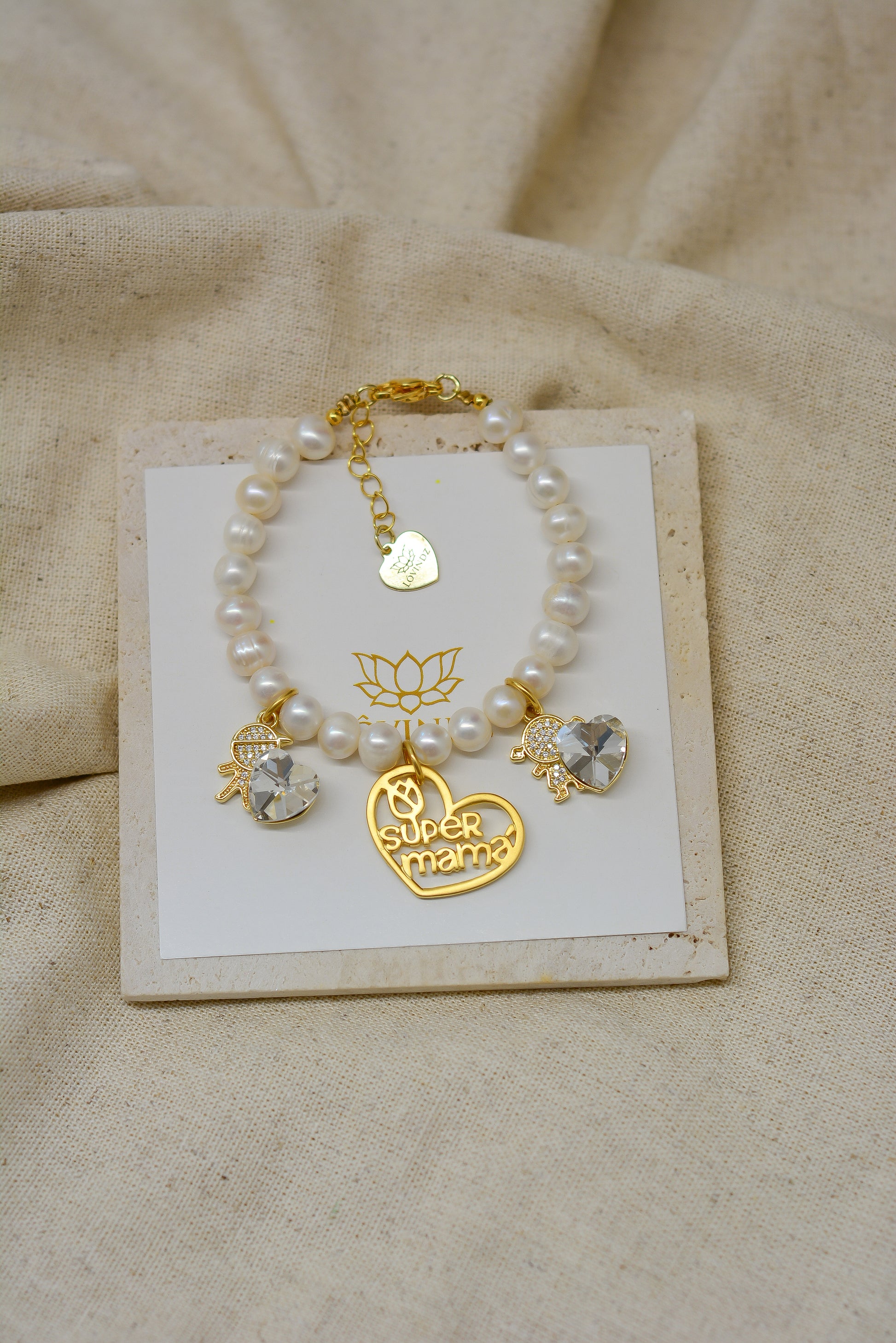 DESCRIPCIÓN: Pulsera hecha en perla de rio, zirconias, cristal (corazón) y chapa de oro de 24 y 18 kilates.
