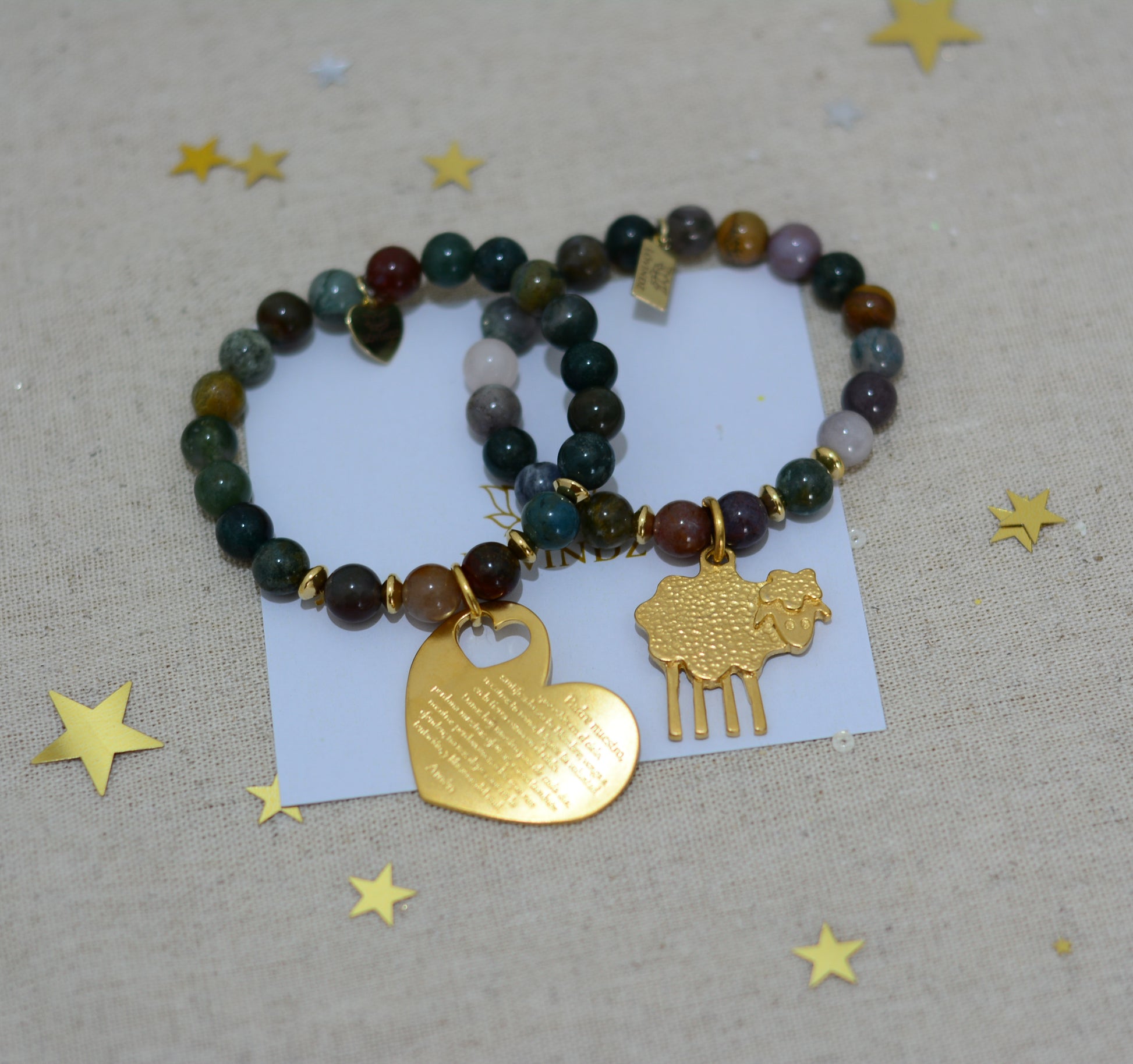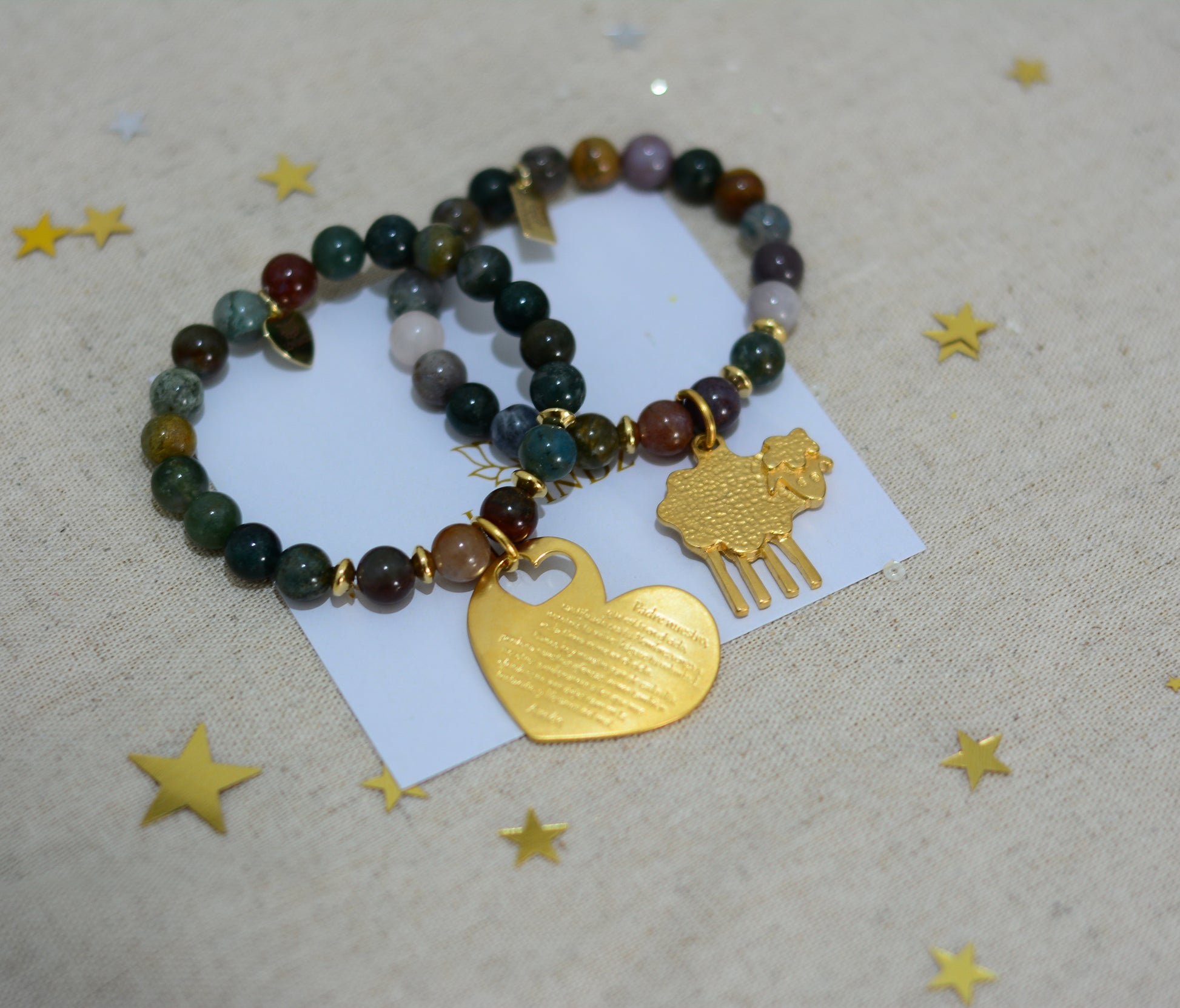 DESCRIPCIÓN: Juego de pulseras hechas en piedra ágata de la India y chapa de oro de 24 kilates.