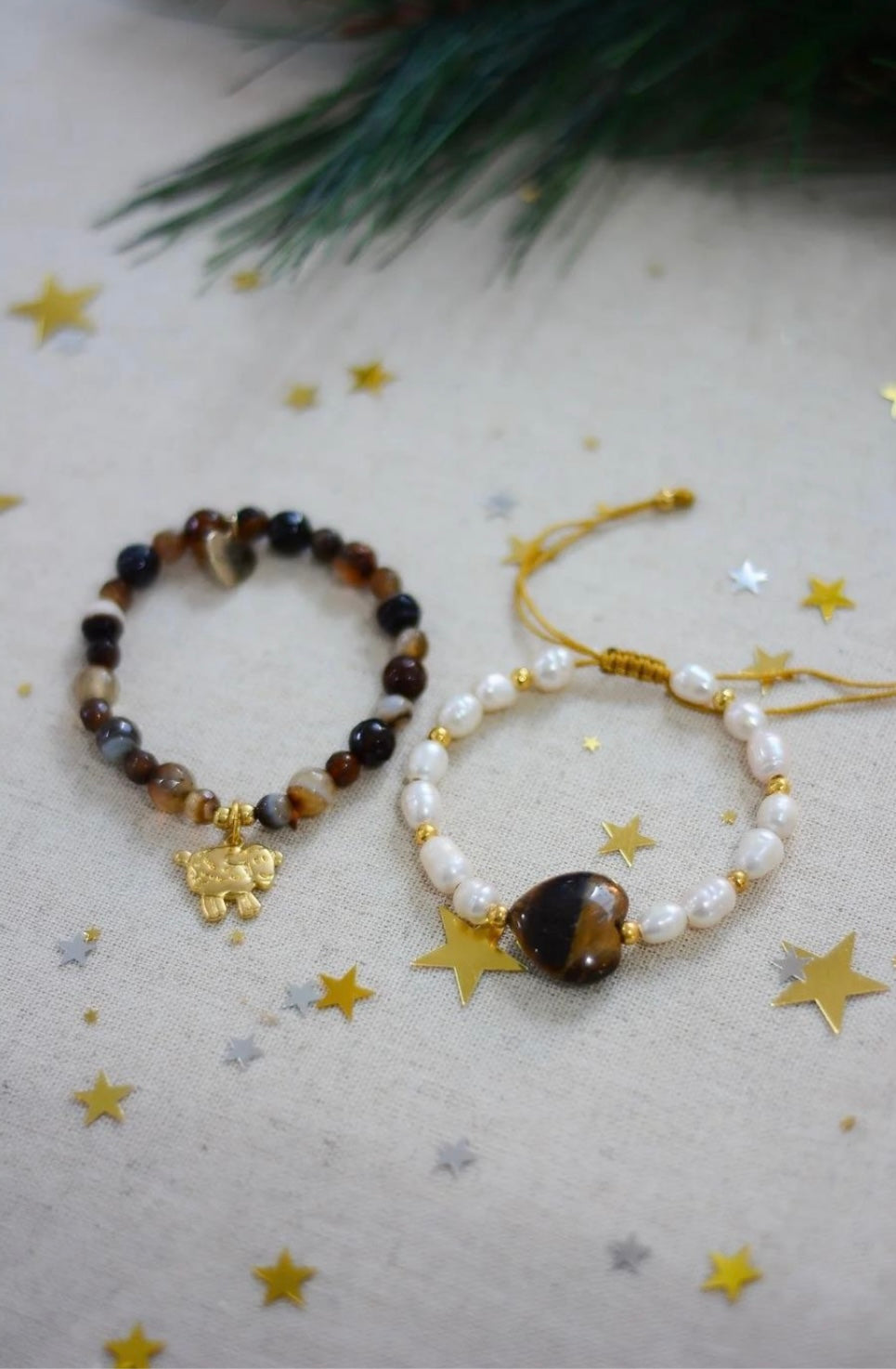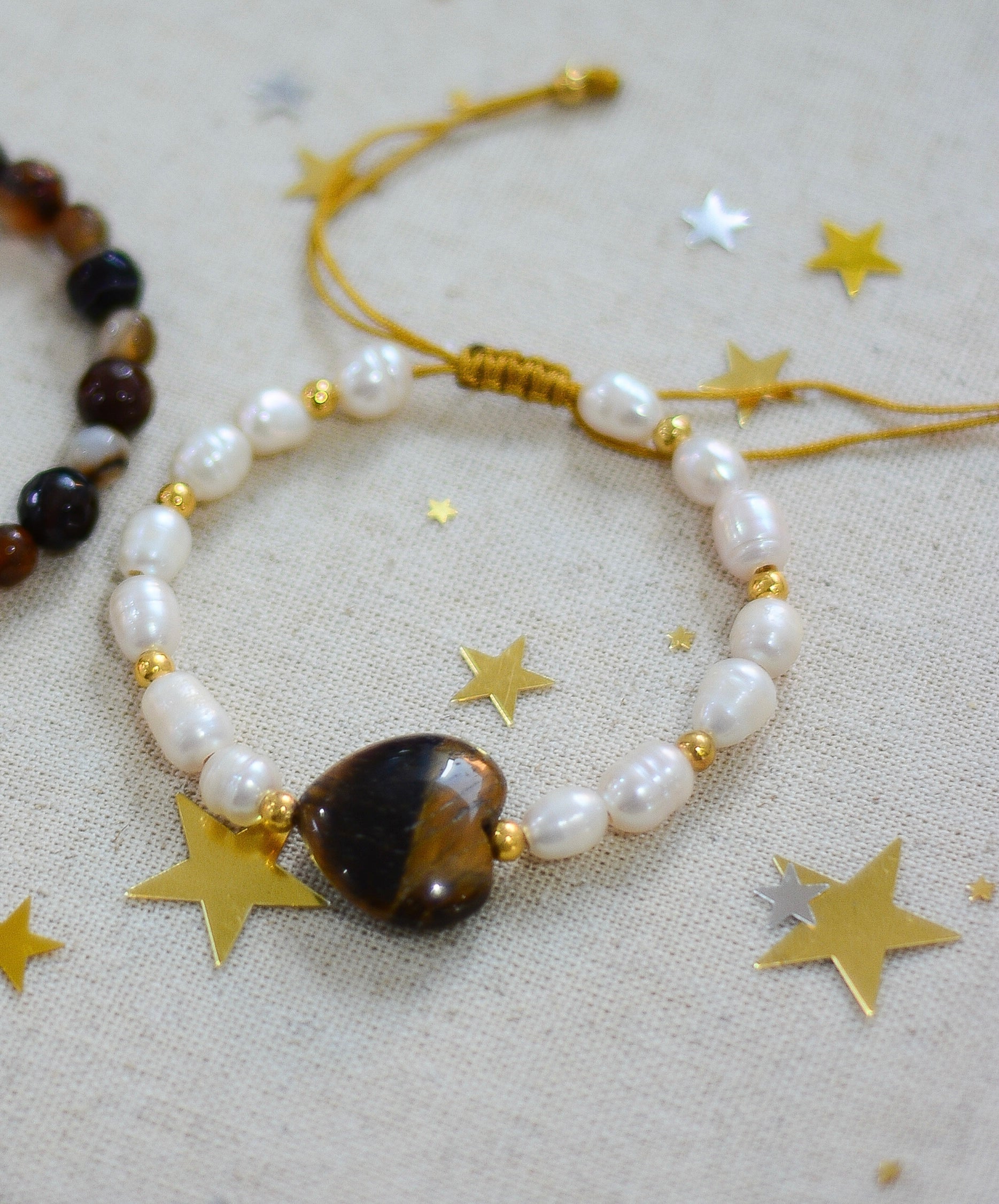 DESCRIPCIÓN: Juego de pulseras hechas en piedra ágata, perla de rio, piedra ojo de tigre y chapa de oro de 24 kt.