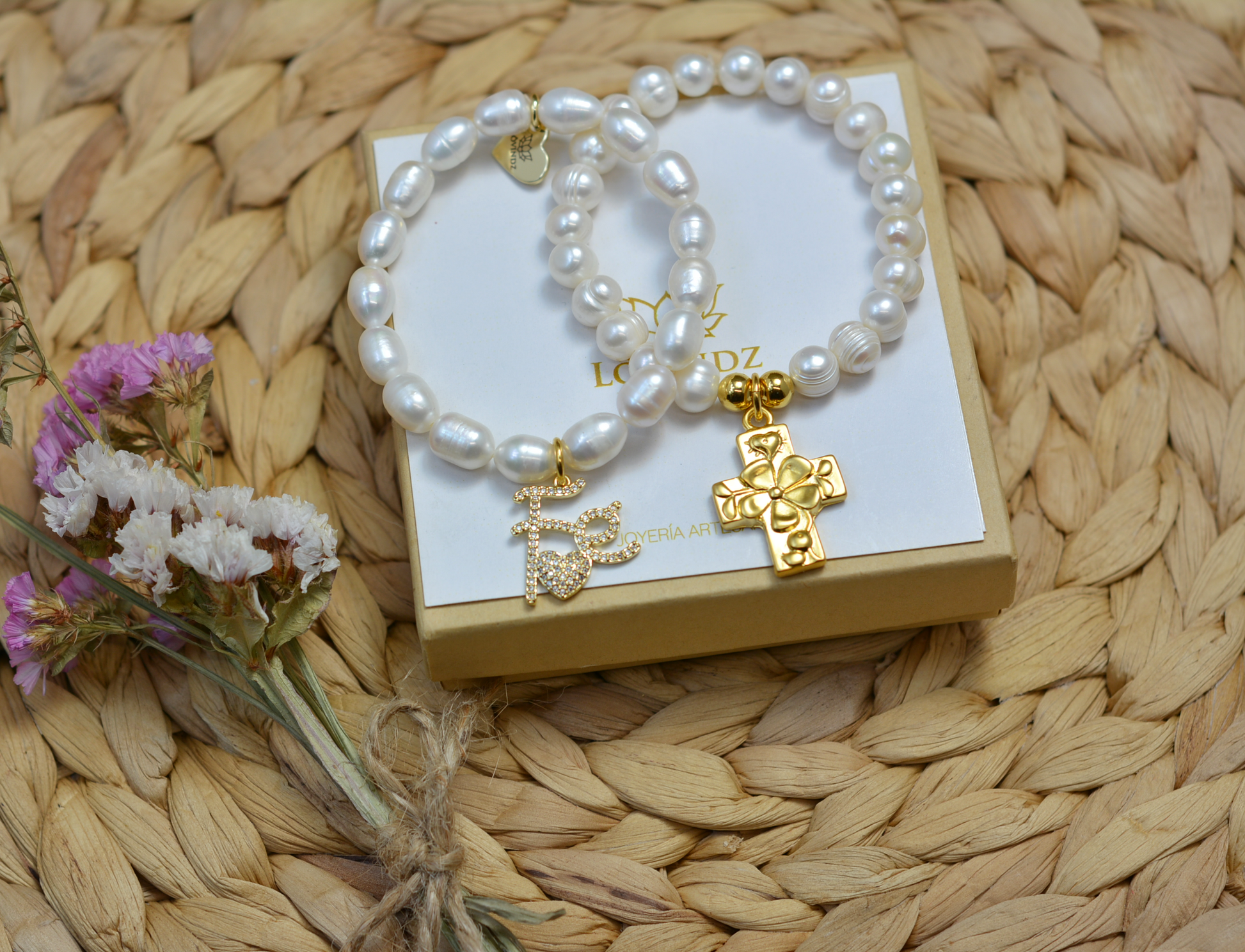 Juego de Pulseras hechas en perla de rio, zirconias y chapa de oro de 24 kilates.