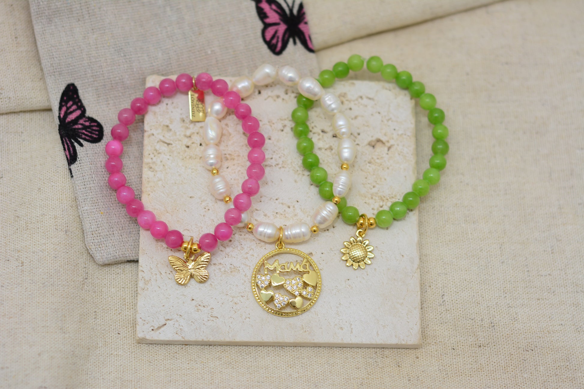DESCRIPCIÓN: Juego de pulseras hechas en piedras jade teñidas, perla de rio, zirconias, acero inoxidable y chapa de oro de 24 kilates.