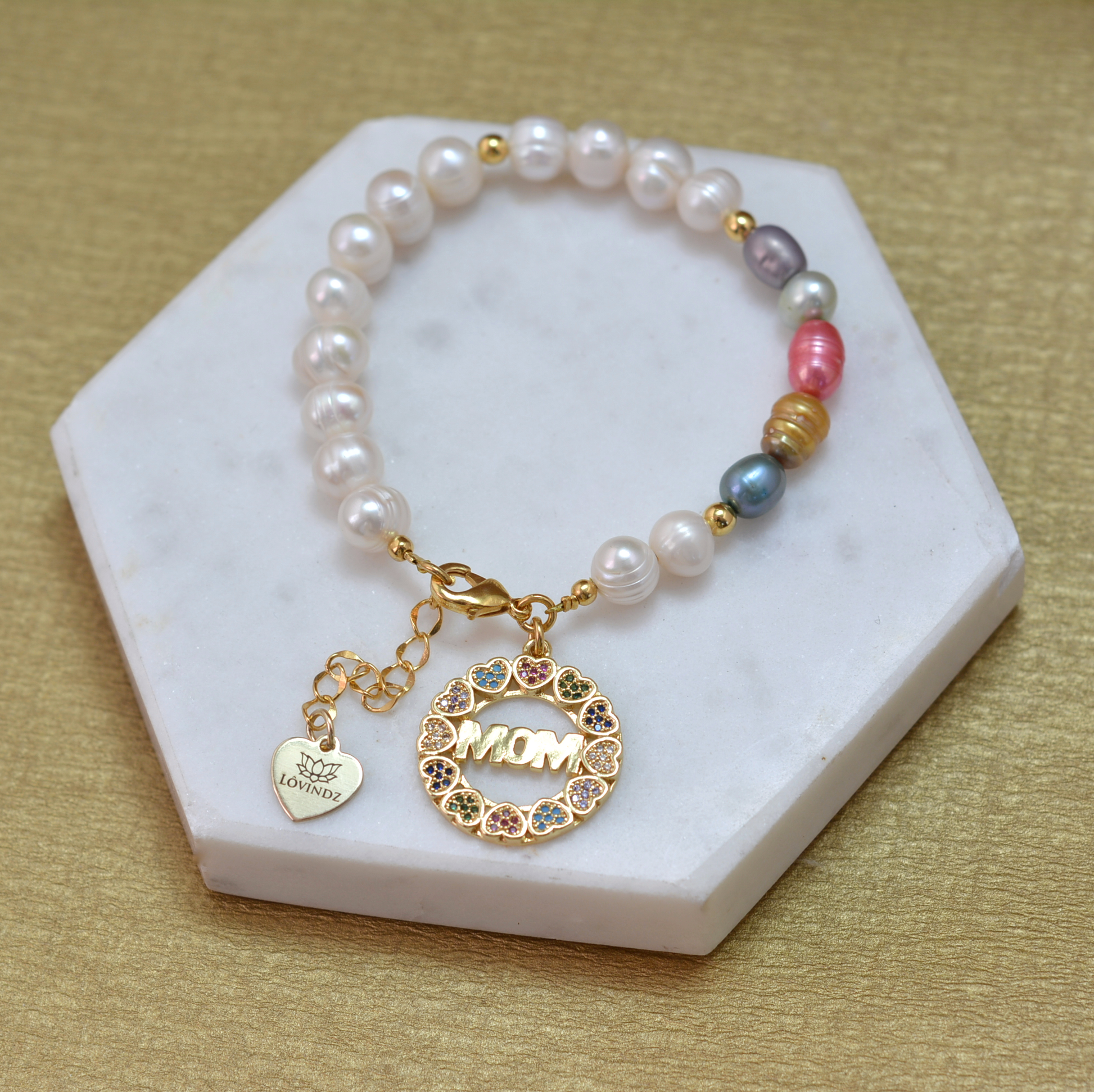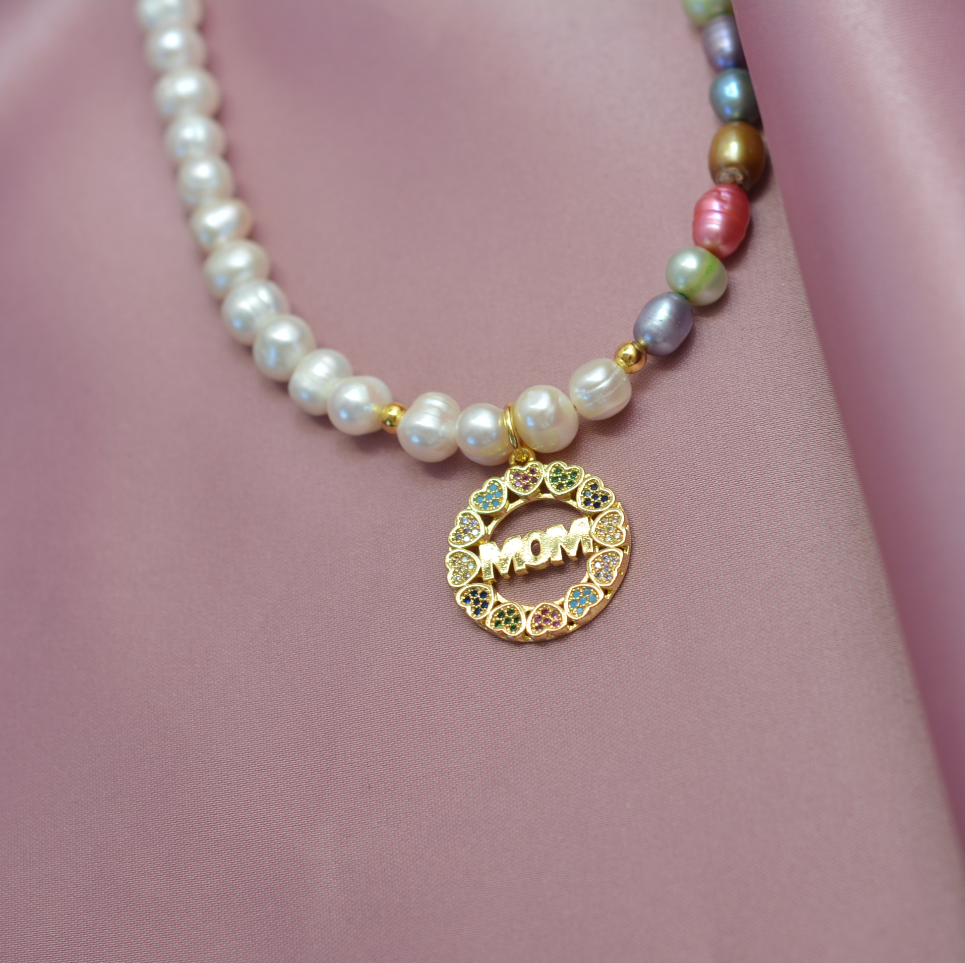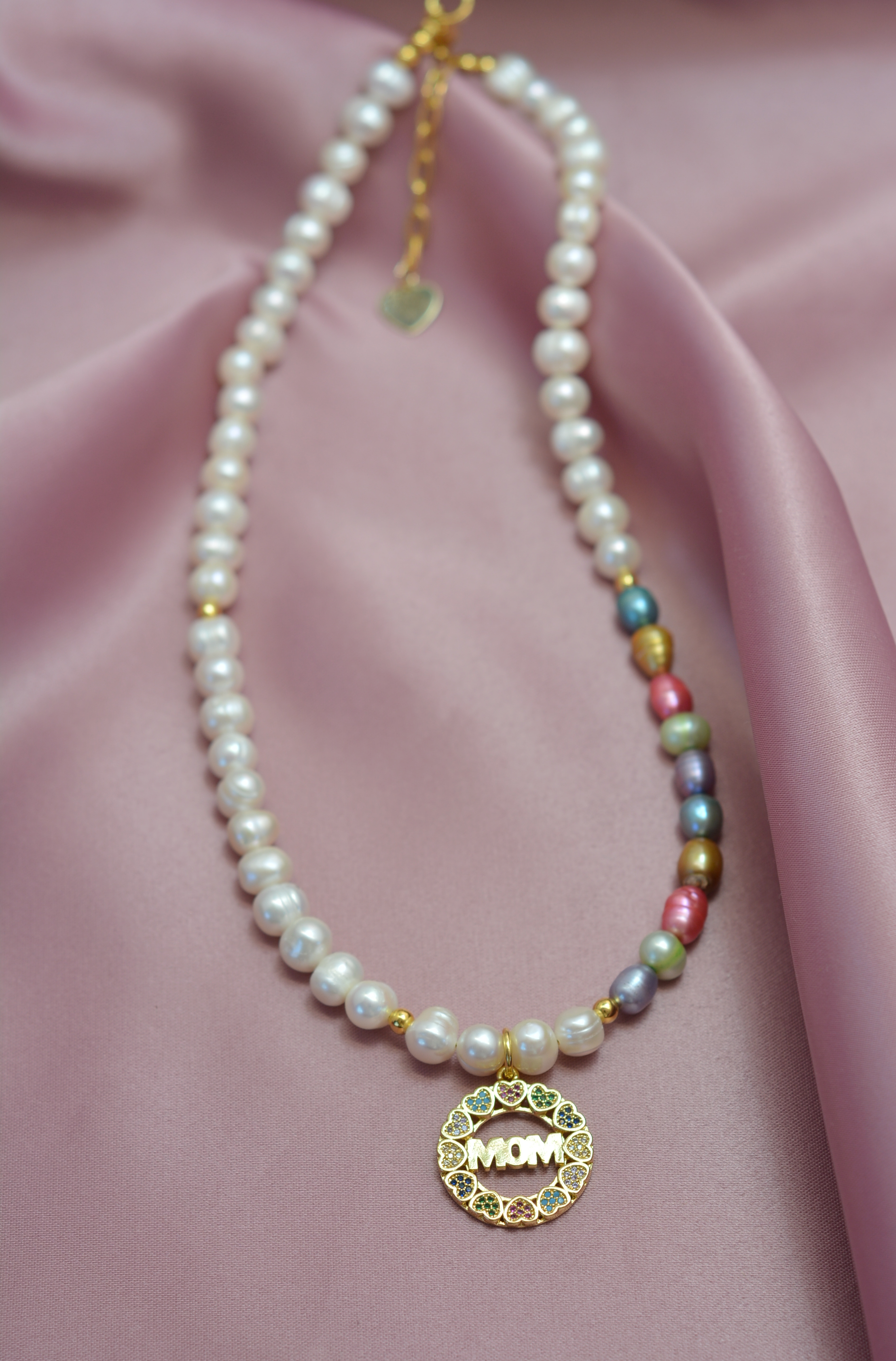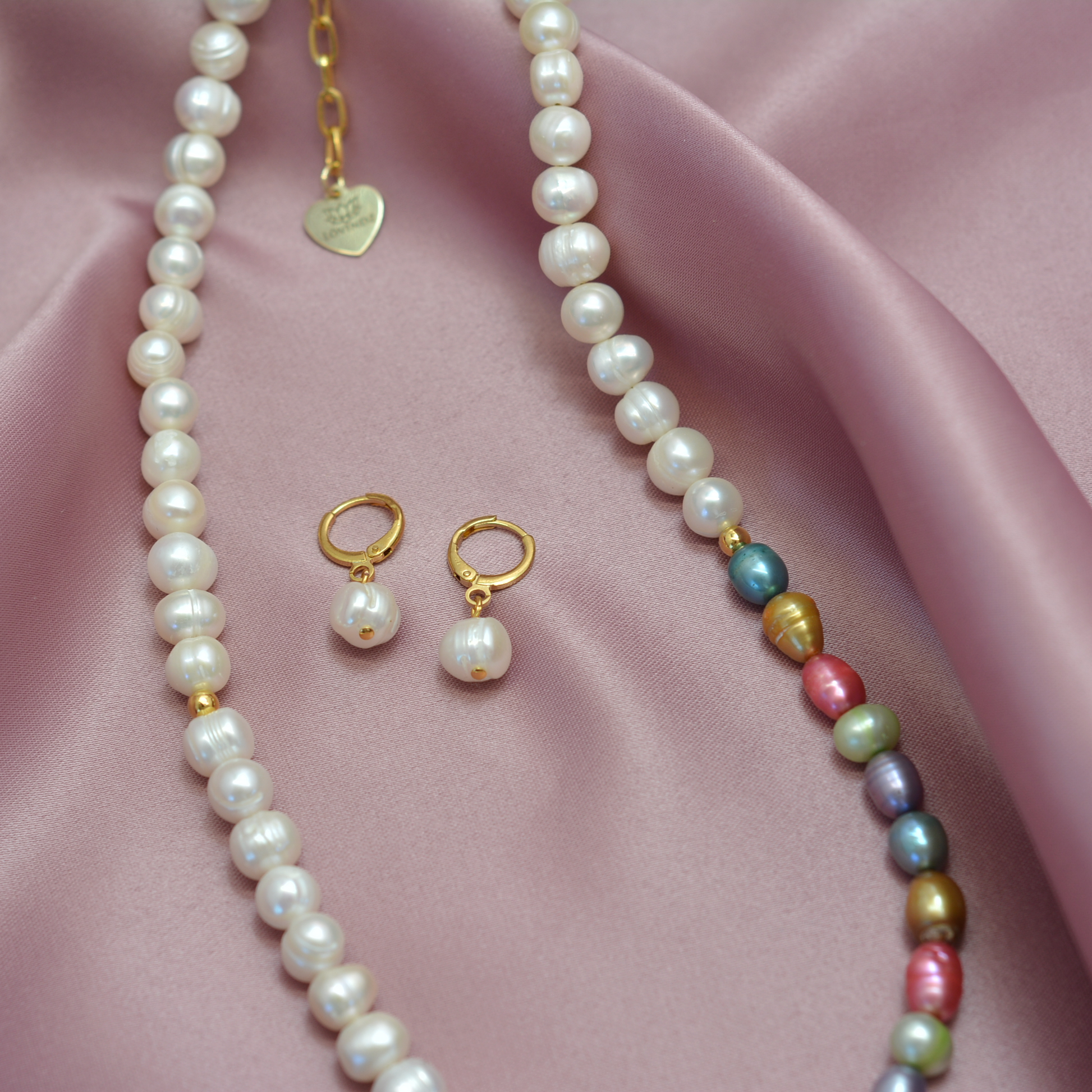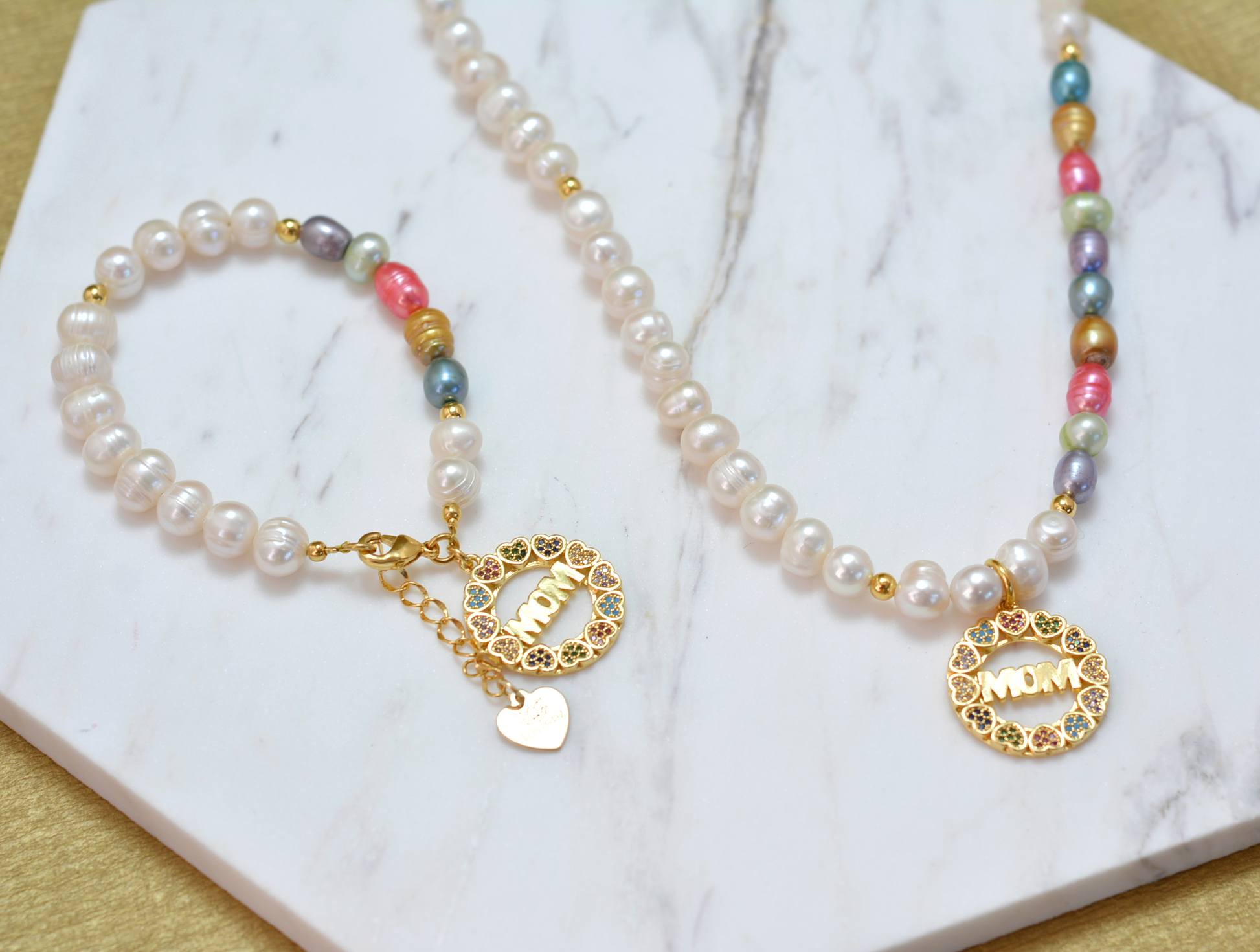 Juego de collar, pulsera y aretes hechos en perla de río, zirconias y chapa de oro de 24 kilates.