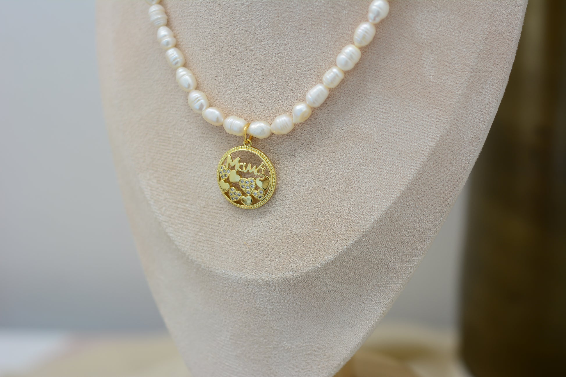 DESCRIPCIÓN: Collar hecho en perla de rio, zirconia y chapa de oro de 24 y 18 kilates.