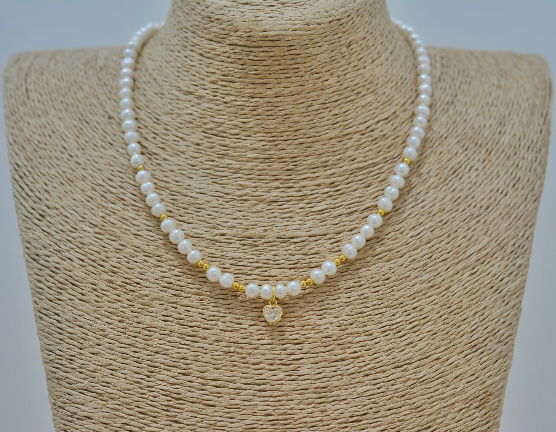 • DESCRIPCIÒN Y MATERIAL: Collar hecho en perla de rio chica, zirconia y chapa de oro de 24 kilates.